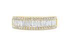 18K yellow gold bold diamond band features twenty baguette-cut diamonds totaling 0.62ctw and sixty-two round brilliant diamonds totaling 0.16ctw, all in G-H colour and VS-SI clarity. The striking design blends geometric lines with classic sparkle for a statement look. Size 6.5.
