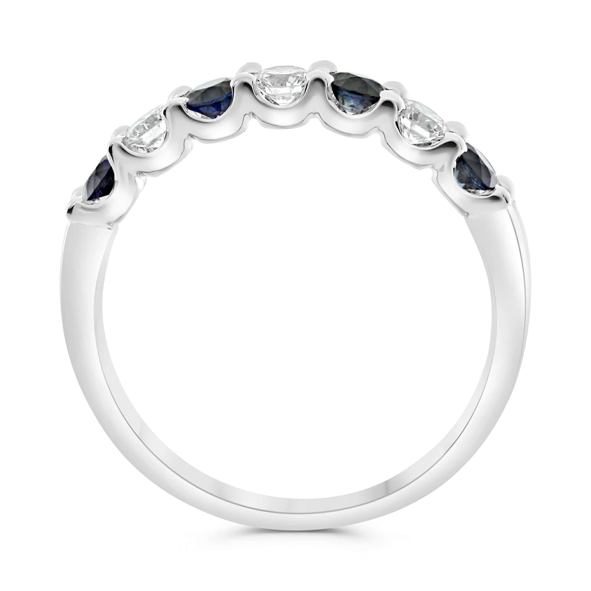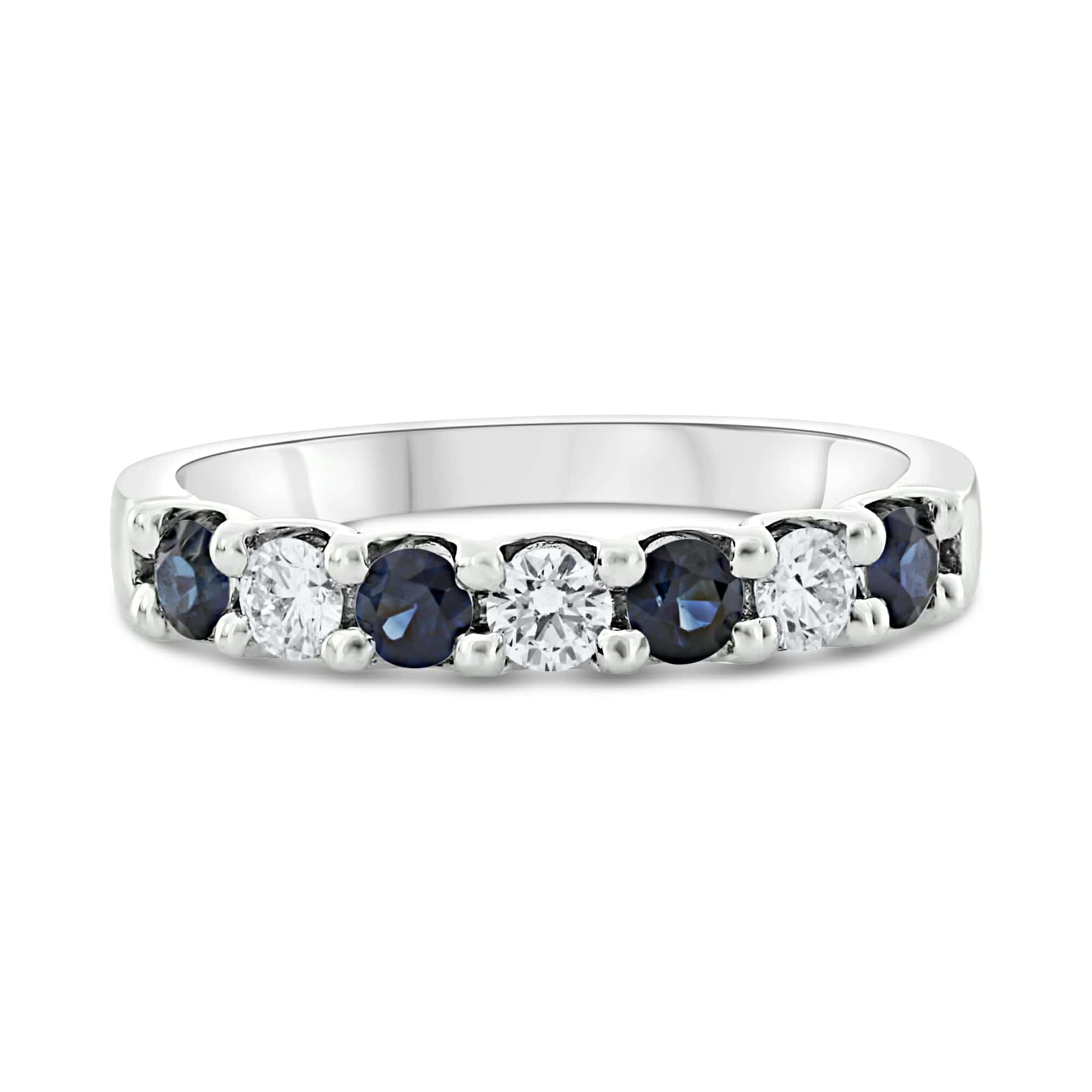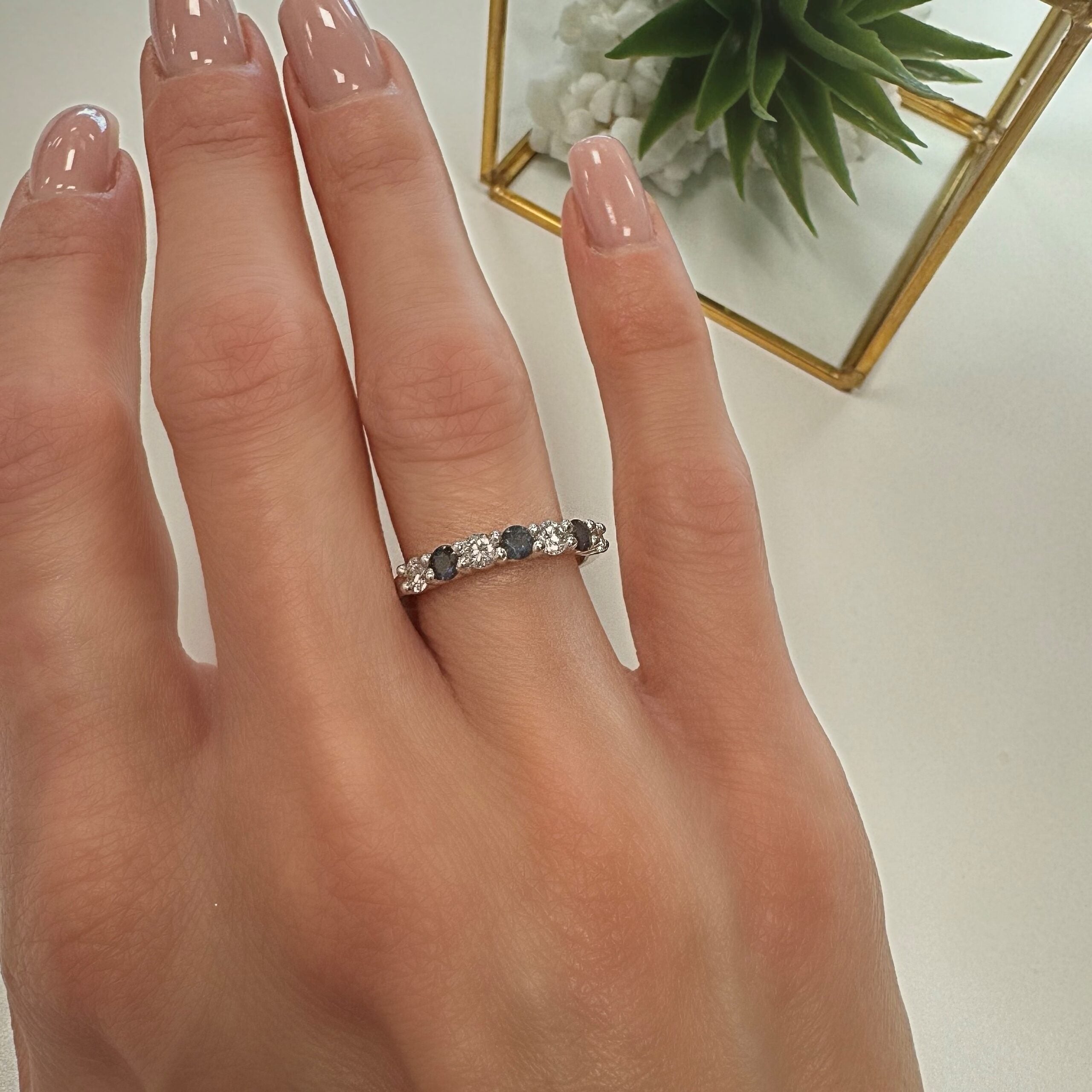 14K white gold band features three round dark-blue sapphires totaling 0.44ctw, all eye-clean, paired with four round brilliant diamonds totaling 0.46ctw in G colour and VS-I clarity. This elegant combination of sapphires and diamonds offers rich contrast and timeless style. Size: 7.
