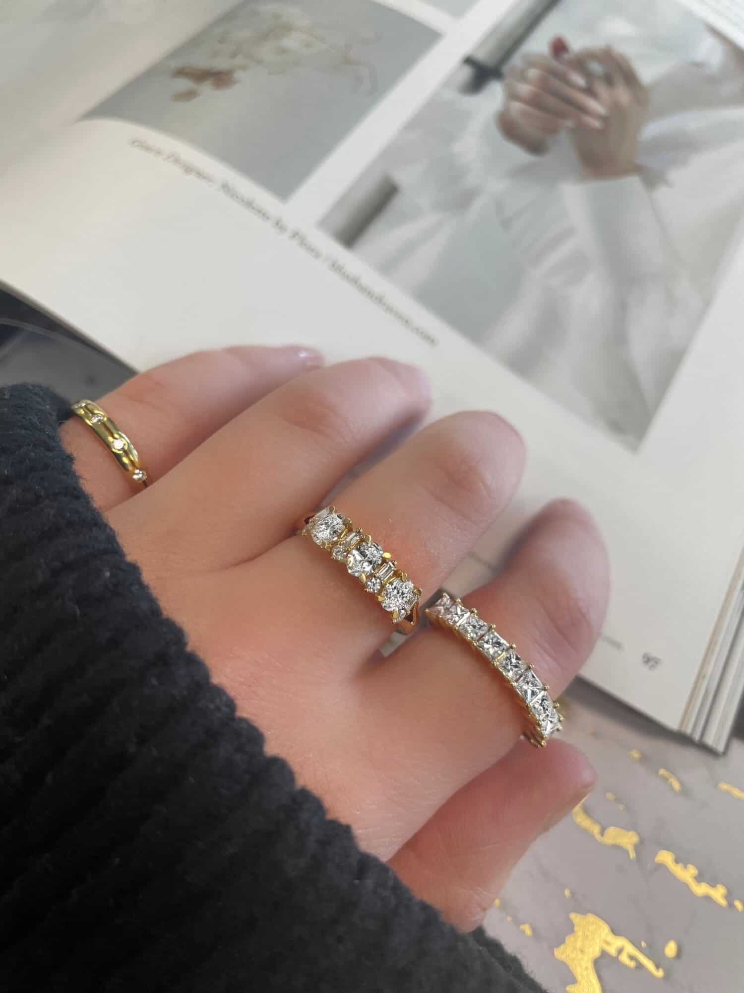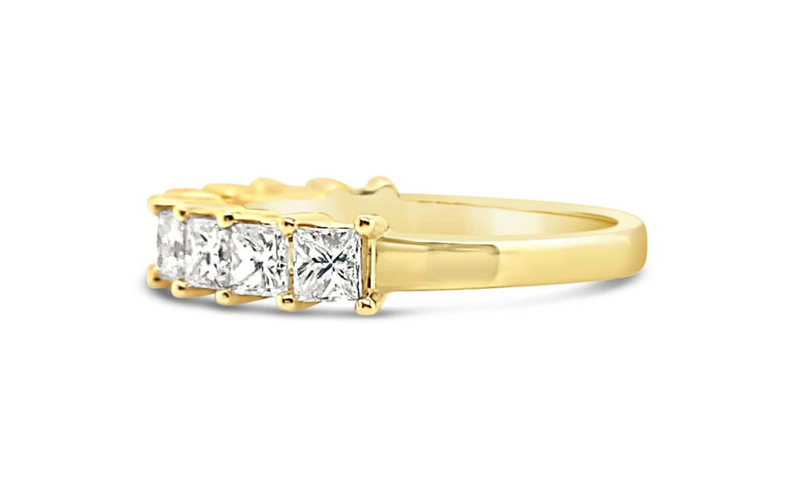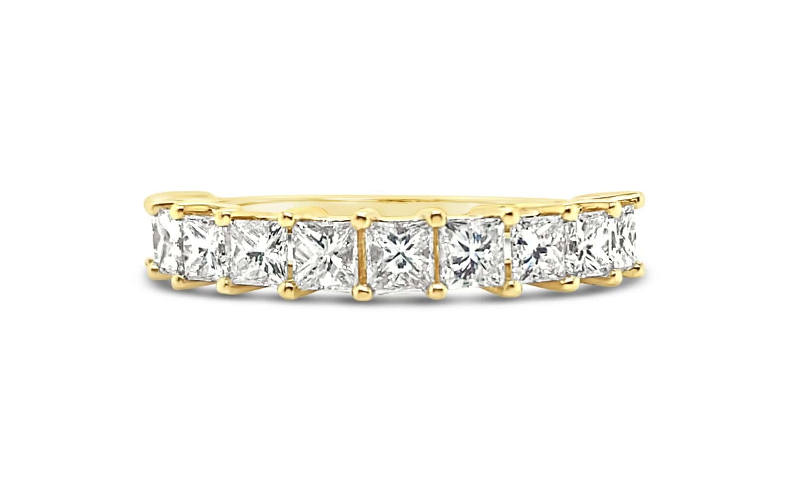 14K yellow gold diamond band features ten princess-cut diamonds totaling 1.62ctw in G-I colour and SI clarity. The bold, clean lines of the princess cuts create a modern and radiant look, perfect for making a statement. Size 7.