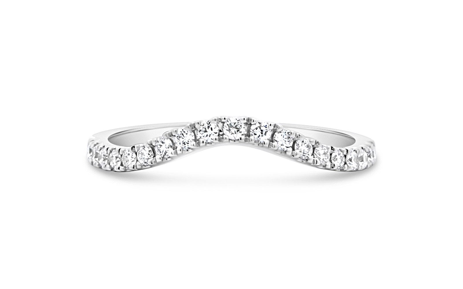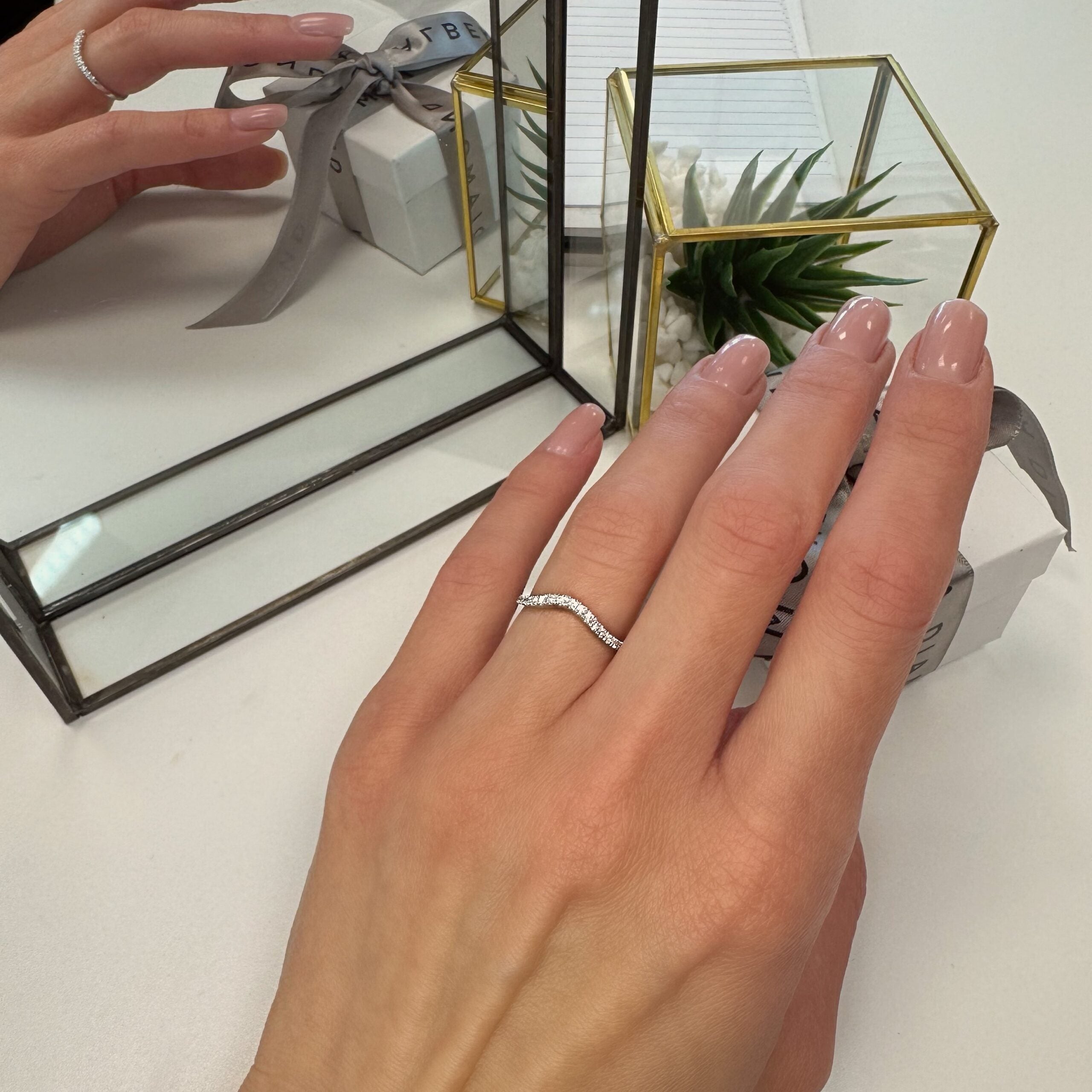 Graceful 14K white gold contour band features 19 round stones totalling 0.21ctw in G-H colour and VS-SI clarity. Designed with a gentle curve, it nestles perfectly against an engagement ring, adding a soft shimmer and elegant harmony to your bridal set. Size 6.25.