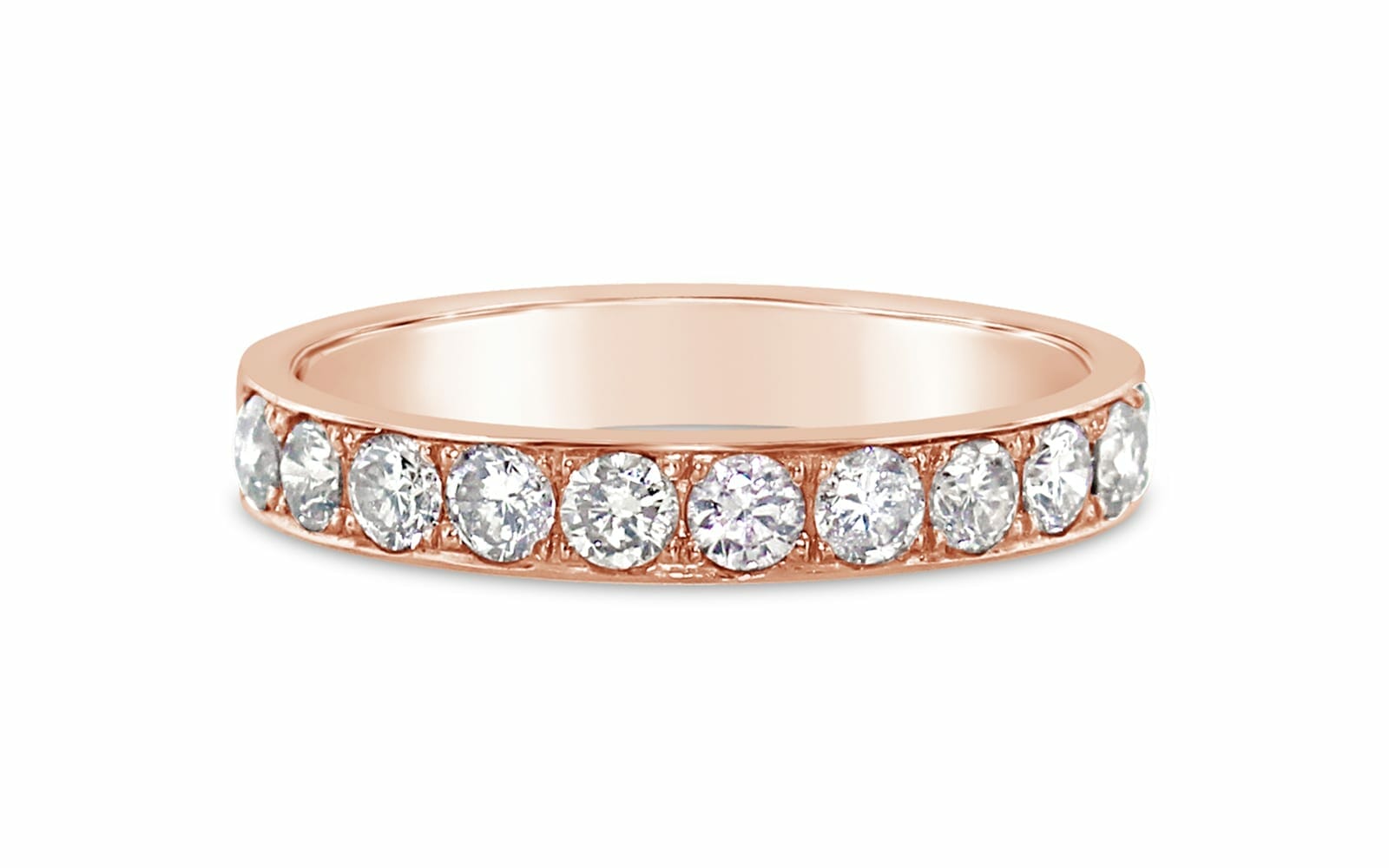 14K rose gold bead-set diamond band features eleven round brilliant diamonds totaling 0.65ctw in H-K colour and SI-I2 clarity. The classic bead-set design offers a timeless look with warm rose gold tones. Size: 6.25.