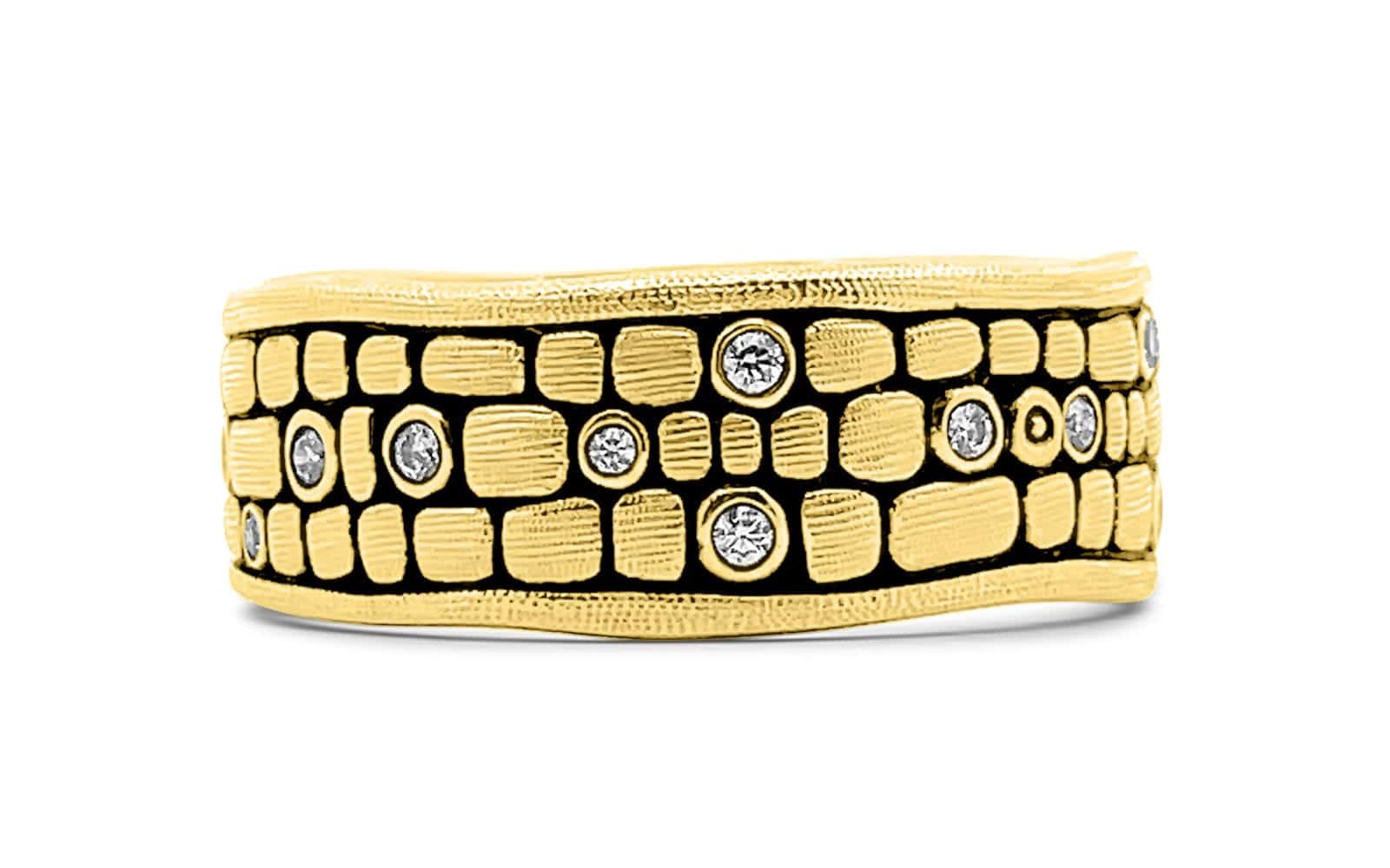 This 18kt yellow gold band features 21 round brilliant cut natural diamonds. This ring is finger size 10. This ring is one of a kind and available as part of our estate collection.