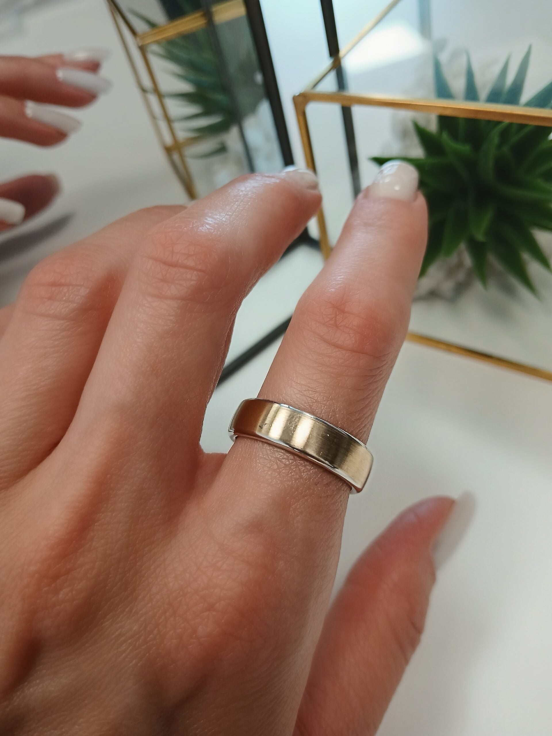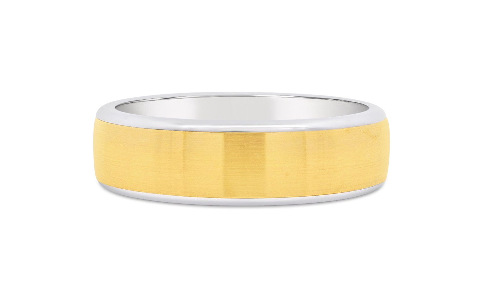 14K white and yellow gold band features a 6.5mm satin-finish white gold centre framed by thin, polished yellow gold Euro edges. The structured design blends subtle texture with clean contrast, offering a contemporary profile that’s both refined and wearable. Size 10.