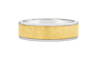 14K white and yellow gold band features a 6.5mm width with a white gold swirl-patterned centre framed by slim polished yellow gold edges. The flowing design adds movement and depth, while the two-tone contrast lends a contemporary yet timeless finish. Size 10.