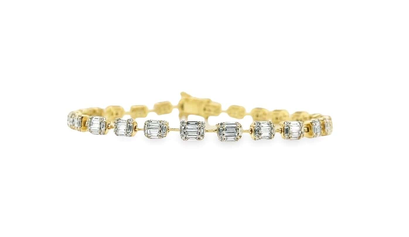 This exquisite 7-inch 14K yellow gold tennis bracelet showcases a stunning combination of 125 baguette cut natural diamonds totalling 3.00ctw and 100 round brilliant cut natural diamonds totalling 0.50ctw. All diamonds are graded G–H in colour and VS–SI in clarity, creating a captivating display of brilliance and refined sophistication.