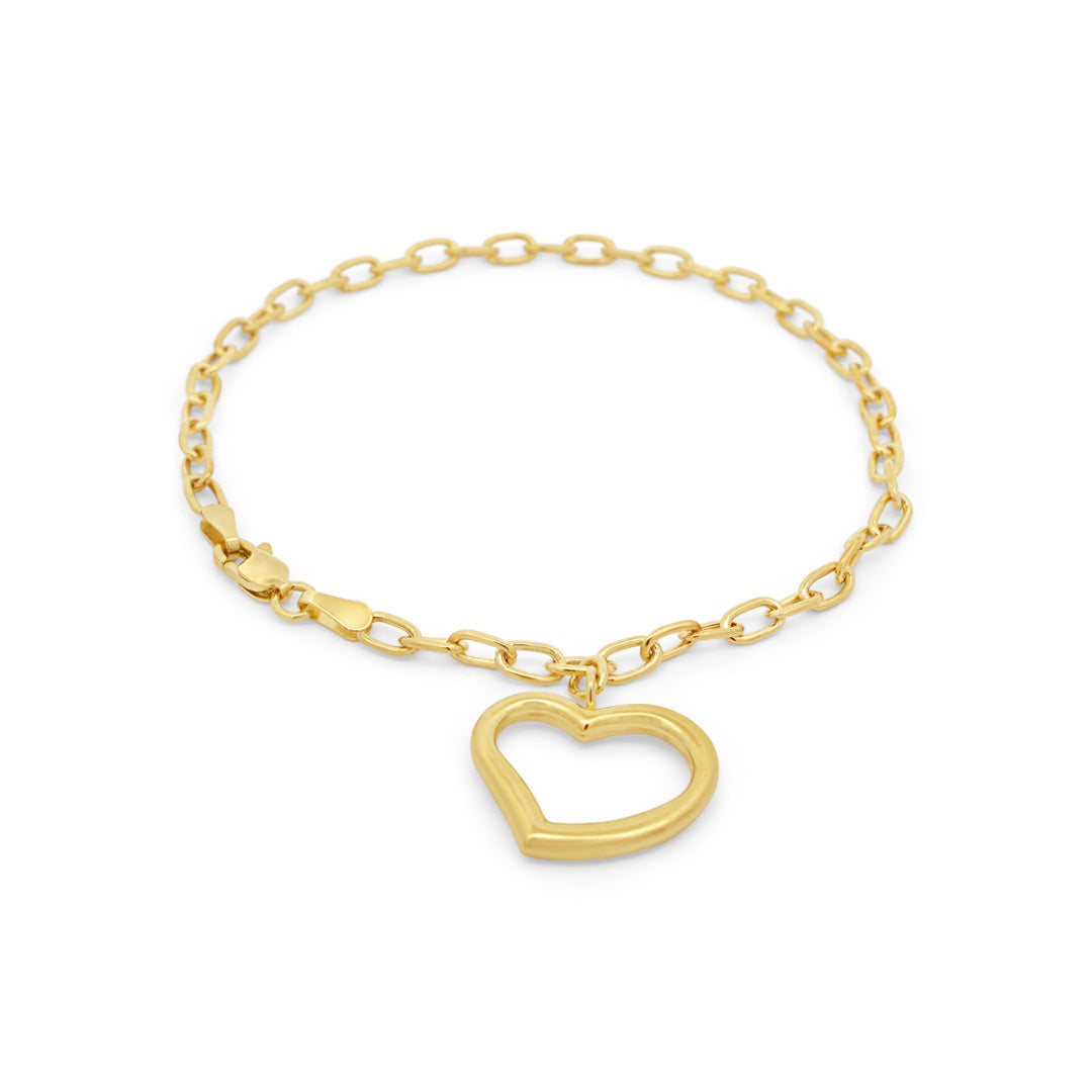 Charming 14K yellow gold bracelet features a delicate hollow heart charm on a classic cable chain. Measuring 7 inches in length and weighing 2.75 grams, it offers a sweet, timeless accent for everyday wear.
