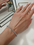 14K white gold tennis bracelet features forty natural round brilliant diamonds totalling 5.07ctw in I–J colour and I1 clarity. Each diamond is individually framed in a sleek bezel setting, offering a modern twist on a classic style with smooth lines and continuous sparkle. Secured with a hidden clasp.