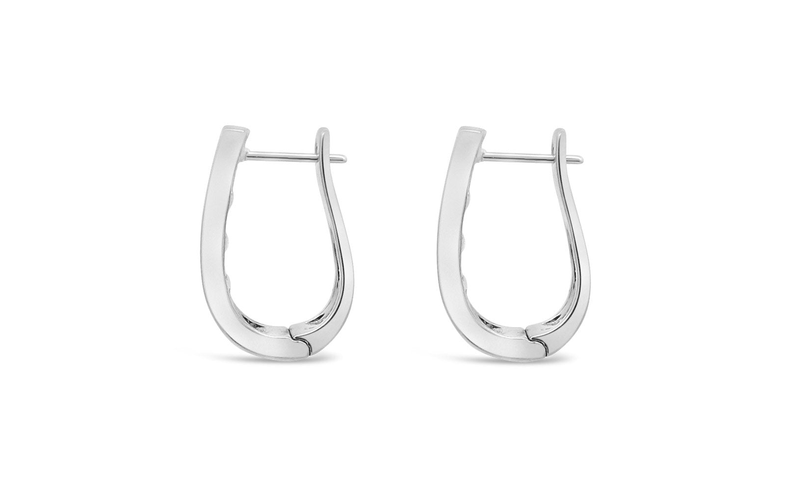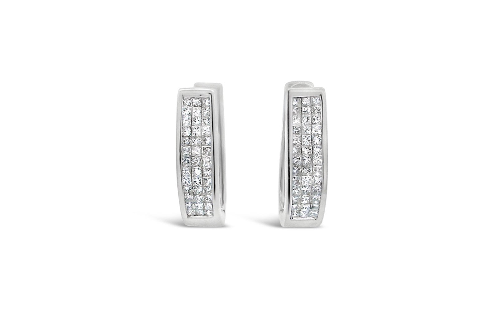 Refined 14K white gold J hoop earrings feature 0.90ctw of princess-cut stones in I-J colour and SI1-I1 clarity, set seamlessly in an invisible setting for a smooth, uninterrupted surface of sparkle. With 78 stones creating a sleek silhouette, these hoops offer everyday elegance with a polished edge.