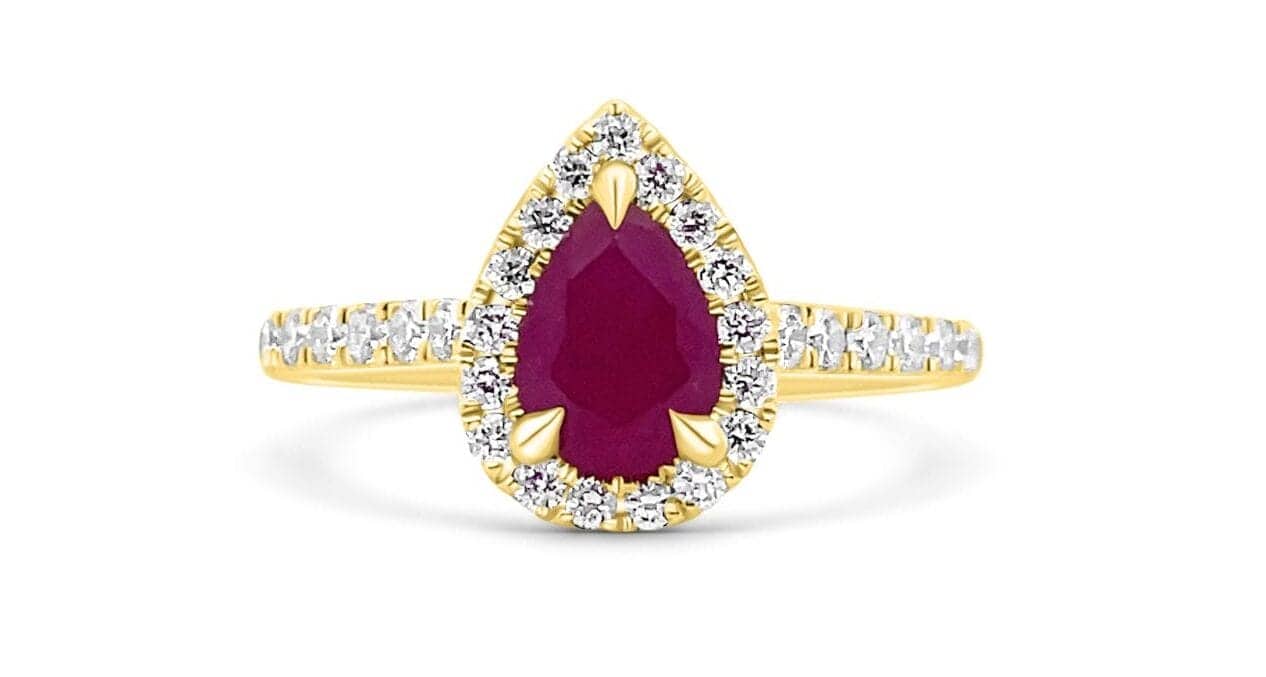 Timeless 14kt yellow gold ring features a magnificent 0.98ct pear shaped natural ruby surrounded by 29 round brilliant cut natural diamonds 0.39ctw G-H colour and VS-SI clarity.