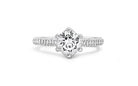 This elegant engagement ring showcases a stunning 0.91ct round brilliant natural diamond, graded H color and SI1 clarity. Accentuating its brilliance, 74 round diamonds totaling 0.18ctw, graded G-H color and VS-SI clarity, create a delicate pavé band that enhances its sparkle. The combination of a timeless 6-prong setting and shimmering accents provides a perfect balance of sophistication and shine. Size 5.75.