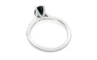 Elegant 14 karat white gold ring features a 1.00ct dark blue eye-clean oval cut natural sapphire accented by 34 round brilliant cut natural diamonds 0.26ctw G-H colour and SI1-SI2 clarity . This ring is currently finger size 4.75.