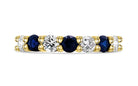 14K yellow gold band features four round dark-blue sapphires totaling 0.52ctw, all eye-clean, paired with three round brilliant diamonds totaling 0.36ctw in F colour and VS-SI clarity. The rich contrast between sapphire and diamond creates a timeless and elegant design. Size 7.