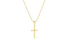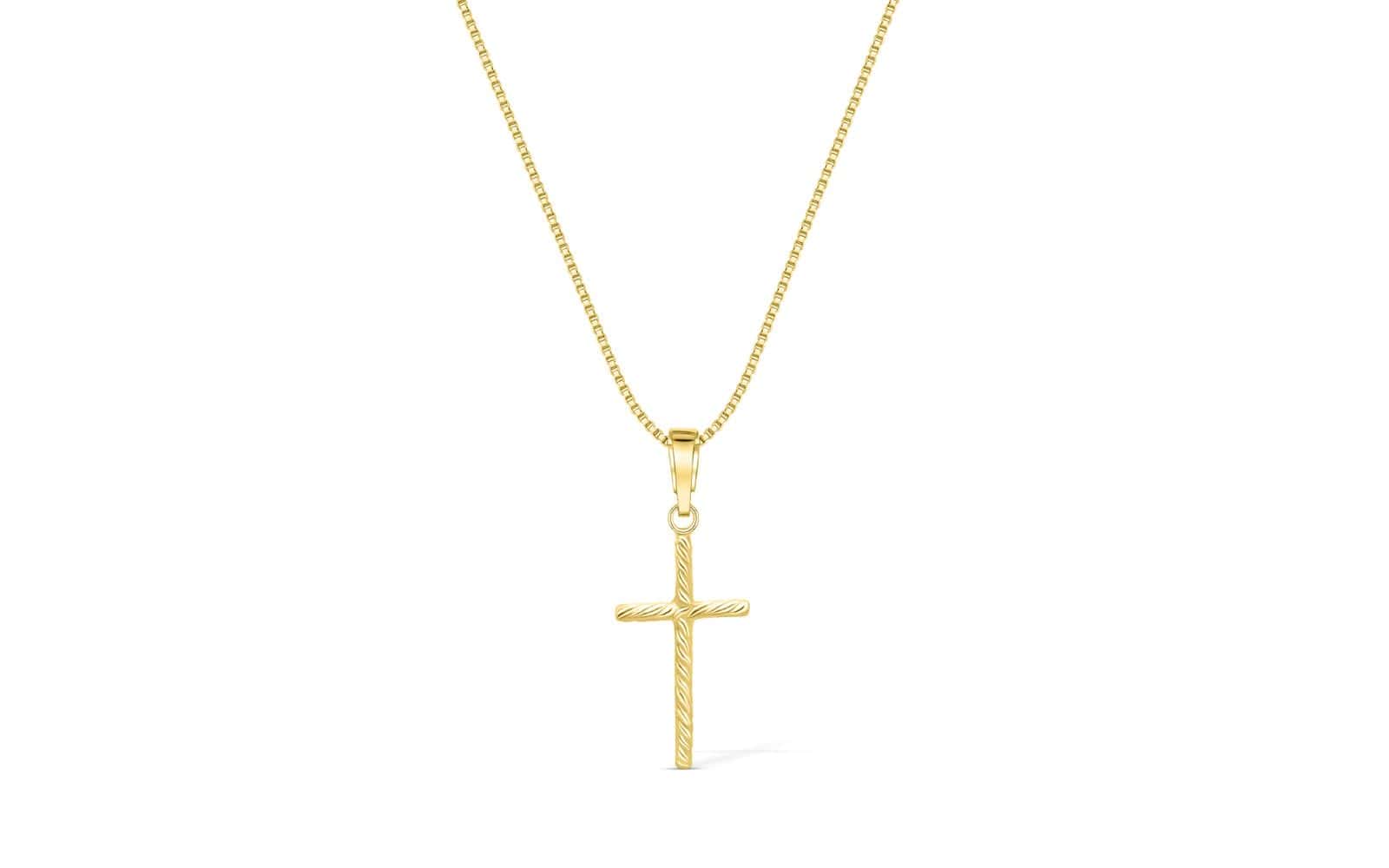 This elegant 14K yellow gold cross pendant showcases a refined rope design that adds subtle texture and depth, gracefully suspended from a 17-inch box chain.