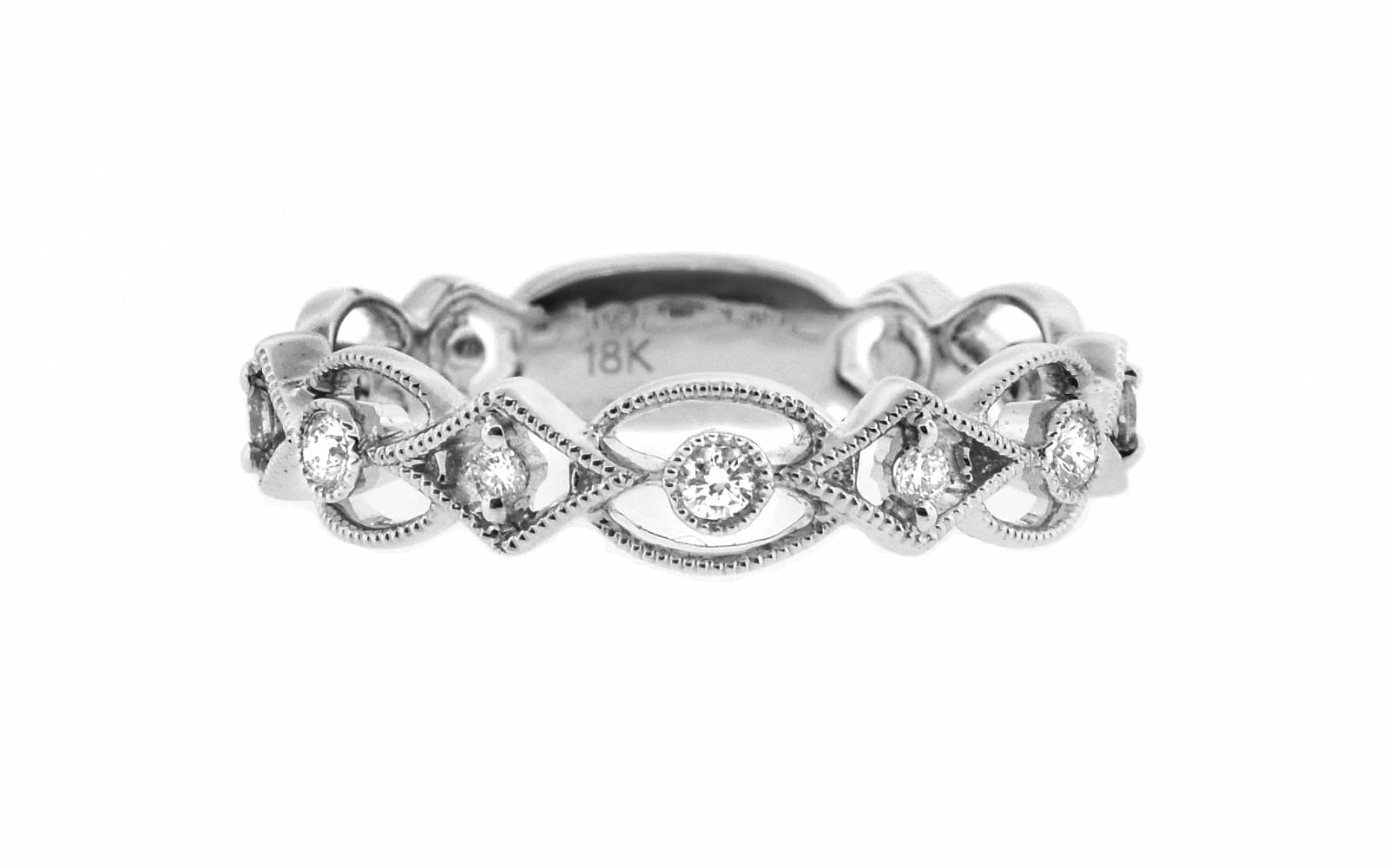 18K white gold band features 9 round brilliant diamonds with millgrain detailing in alternating shapes to give it a unique feel. This ring is finger size 5.75.