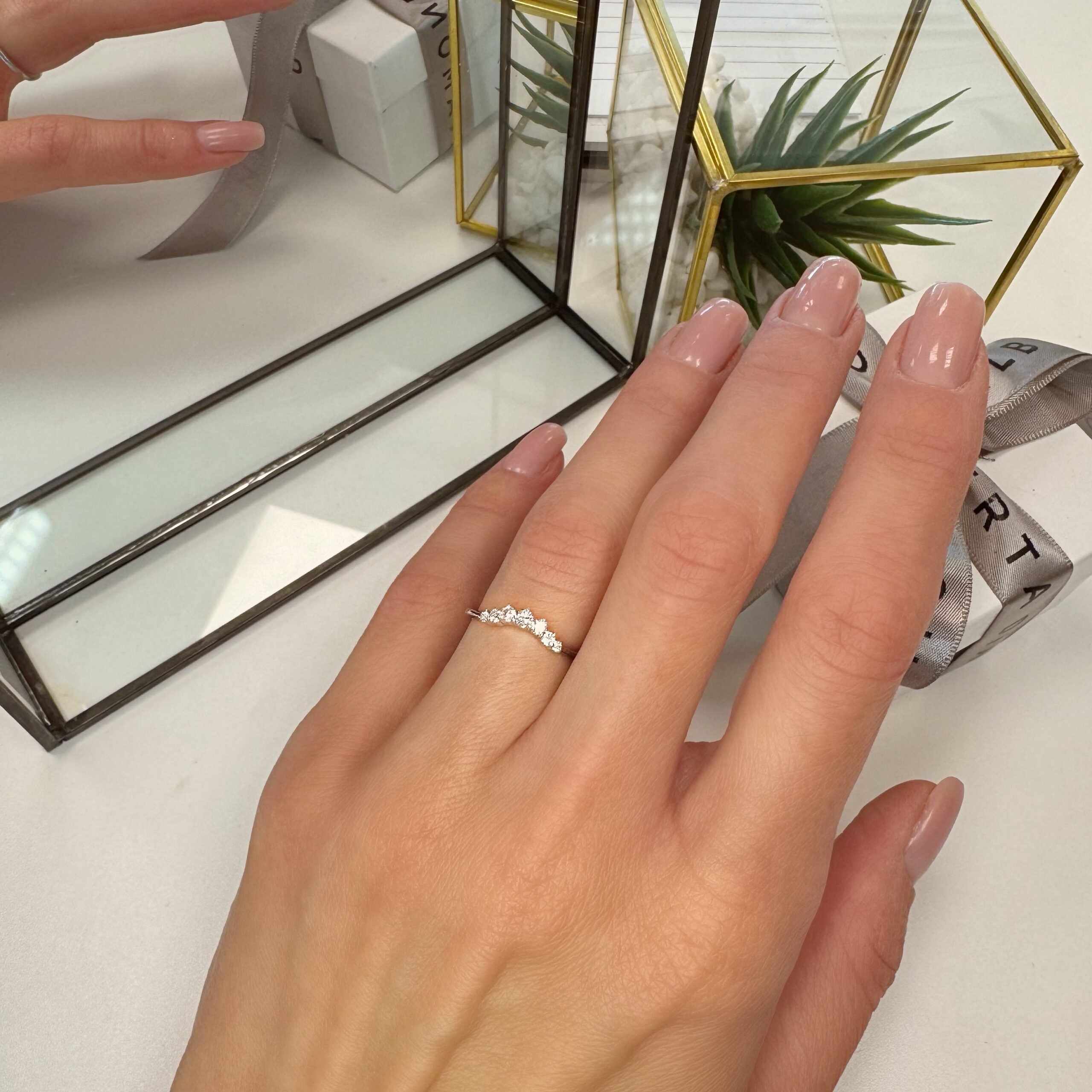Graceful 14K white gold contour band features 7 round stones totalling 0.20ctw in G-H colour and VS-SI clarity. Gently curved to nestle alongside an engagement ring, it adds a soft shimmer and a polished finish to your bridal set. Size 6.75.
