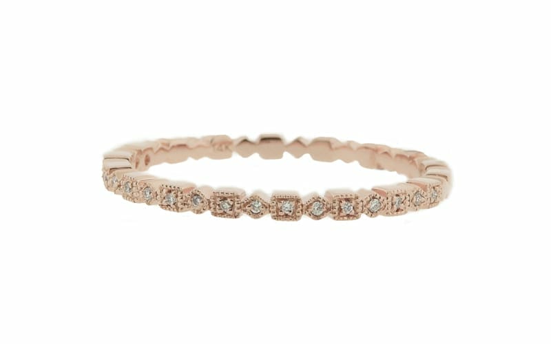 This beautiful band features 19 diamonds set in a unique geometric pattern. Currently available in rose gold, finger size 6.5.