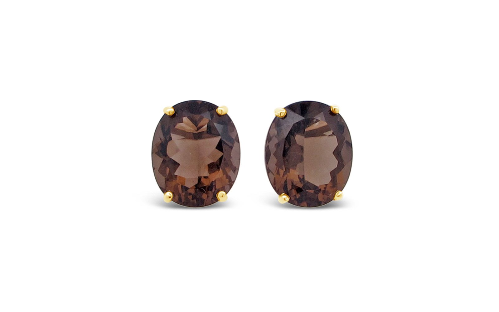 Warm and earthy 10KY stud earrings feature two oval-cut natural smokey quartz stones totalling 8.58ctw. Set in classic four-prong settings, the rich brown hues of the quartz offer a grounded elegance that transitions effortlessly from day to night. A bold yet refined accessory with natural depth.