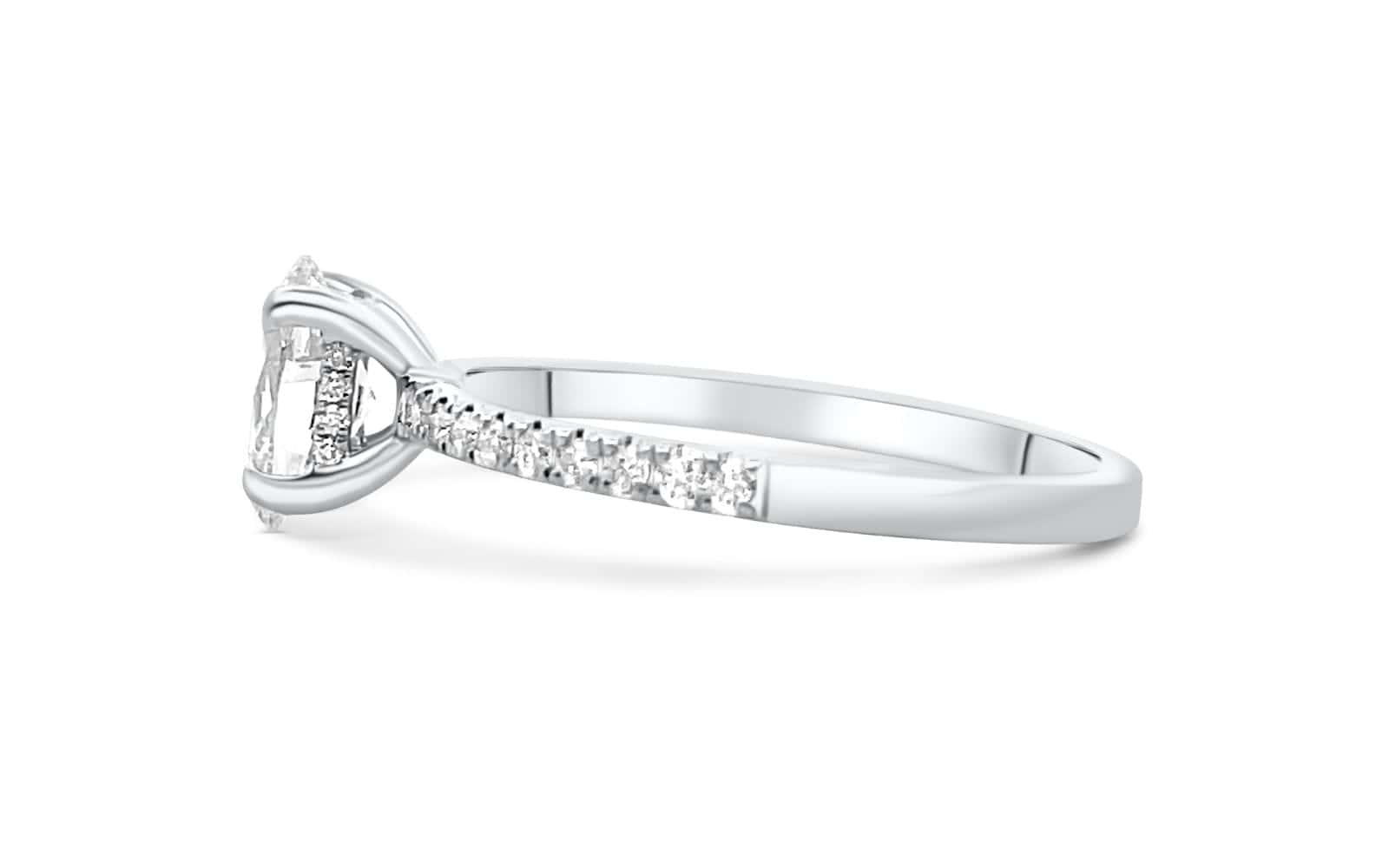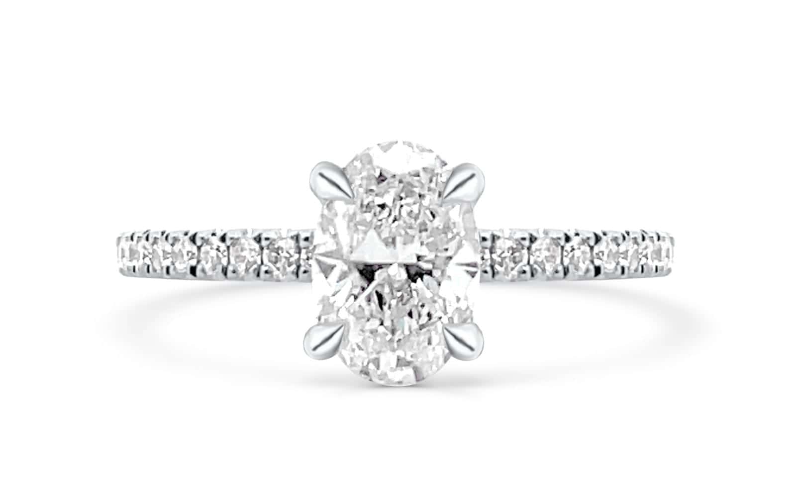 This elegant 14kt white gold ring features a 0.82ct oval cut lab-grown diamond accented by 36 round brilliant cut natural diamonds.