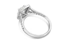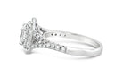 Elegant 18 karat white gold ring features a 0.93ct E VS2 assher cut natural diamond surrounded by 66 round brilliant cut natural diamonds 0.47ct G-H colour and VS-SI clarity. This ring is currently finger size 6.