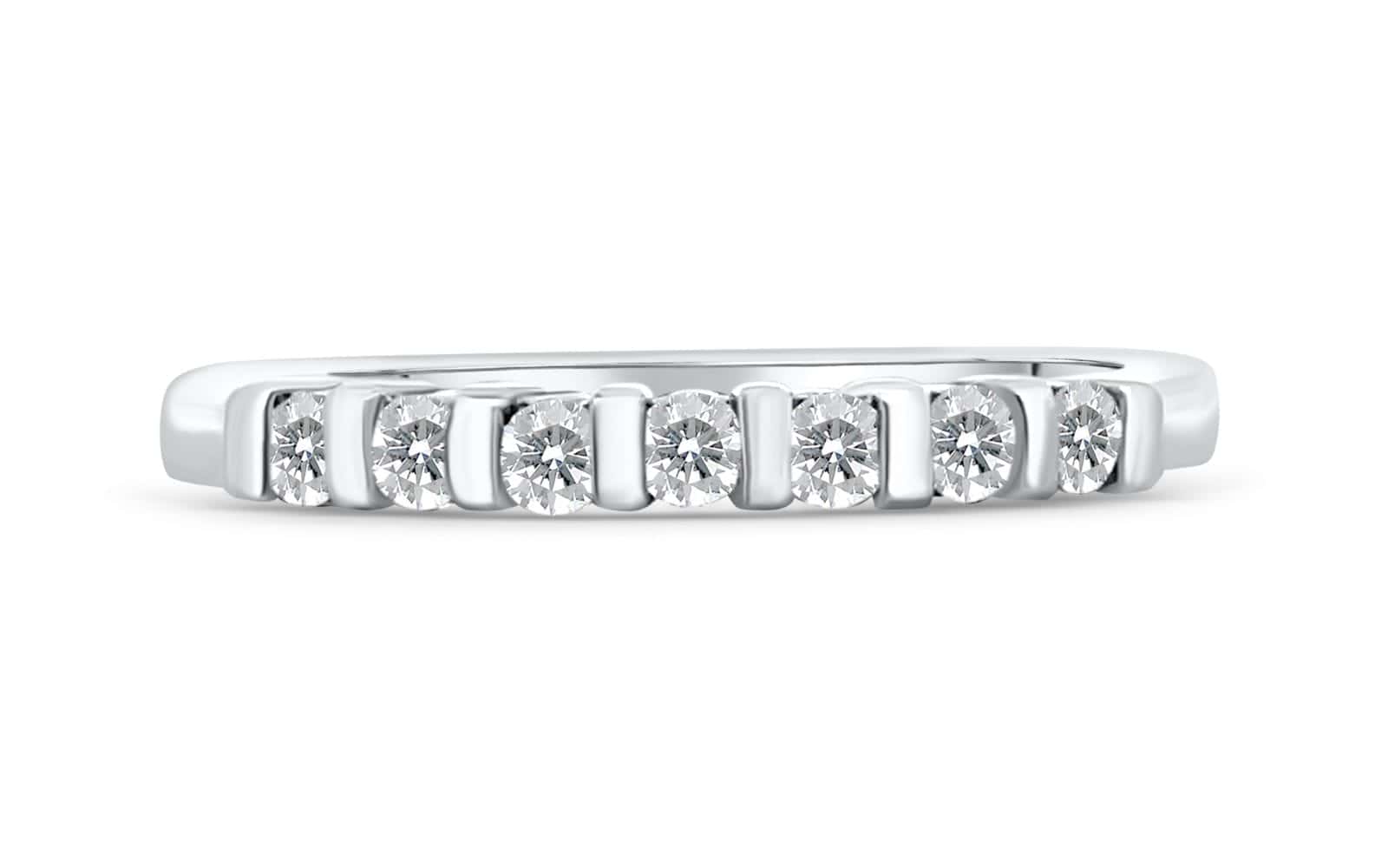 14kt white gold band features 7 round brilliant diamonds, 0.21 total carat weight, G-I colour, VS-I clarity, bar-set to maximize their sparkle.