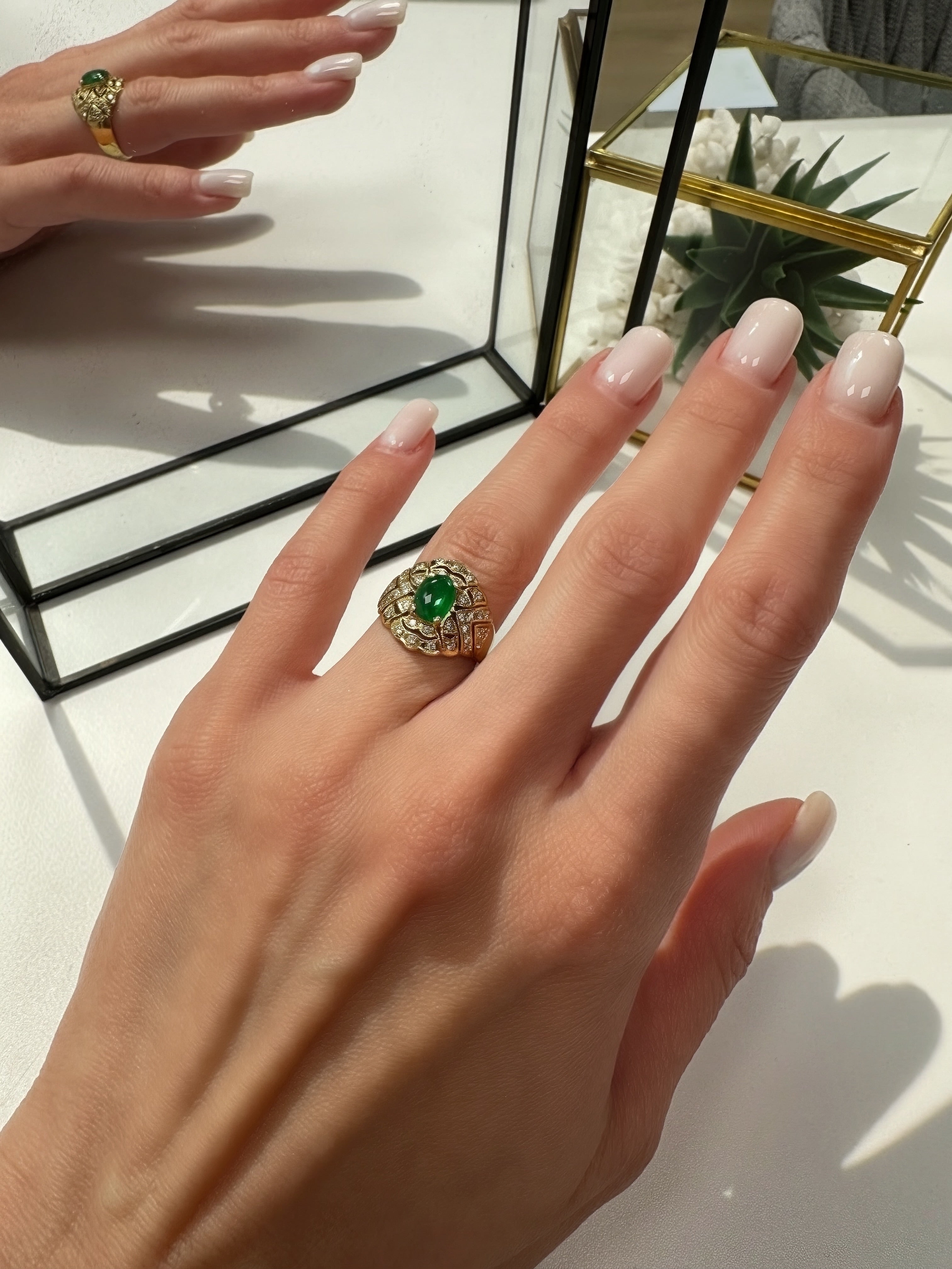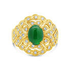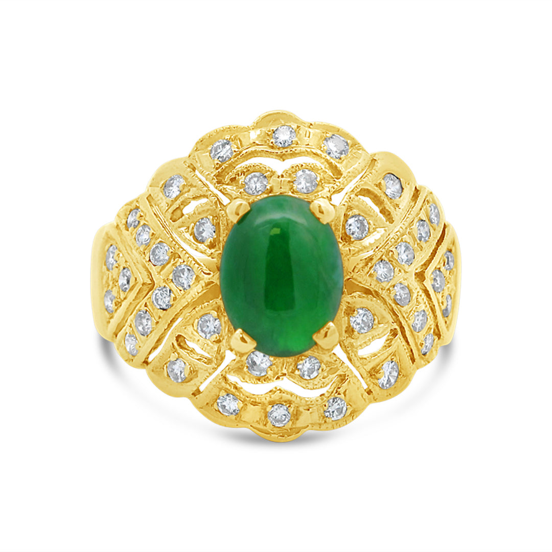 Ornate 14K yellow gold ring features a vibrant oval jadeite centre totalling 0.80ct, accented by 38 natural round diamonds totalling 0.50ctw in F–G colour and SI1–I1 clarity. Size 6.25, offering balanced elegance and sparkle.