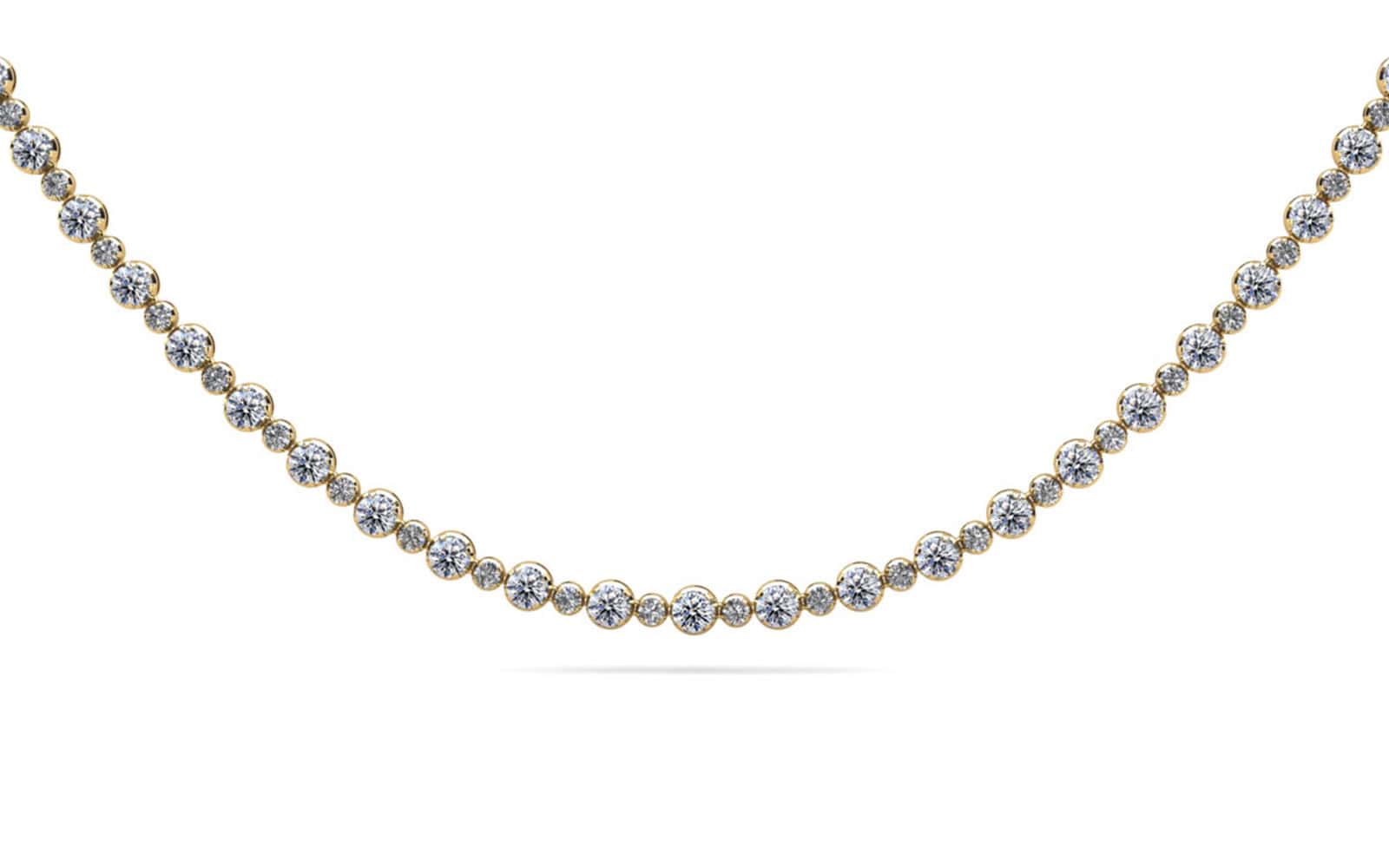 Timeless 14K yellow gold tennis necklace features 138 natural round diamonds totalling 5.50ctw. The continuous line of sparkling brilliance creates a classic, elegant look that drapes beautifully along the neckline, making it perfect for both everyday wear and special occasions.