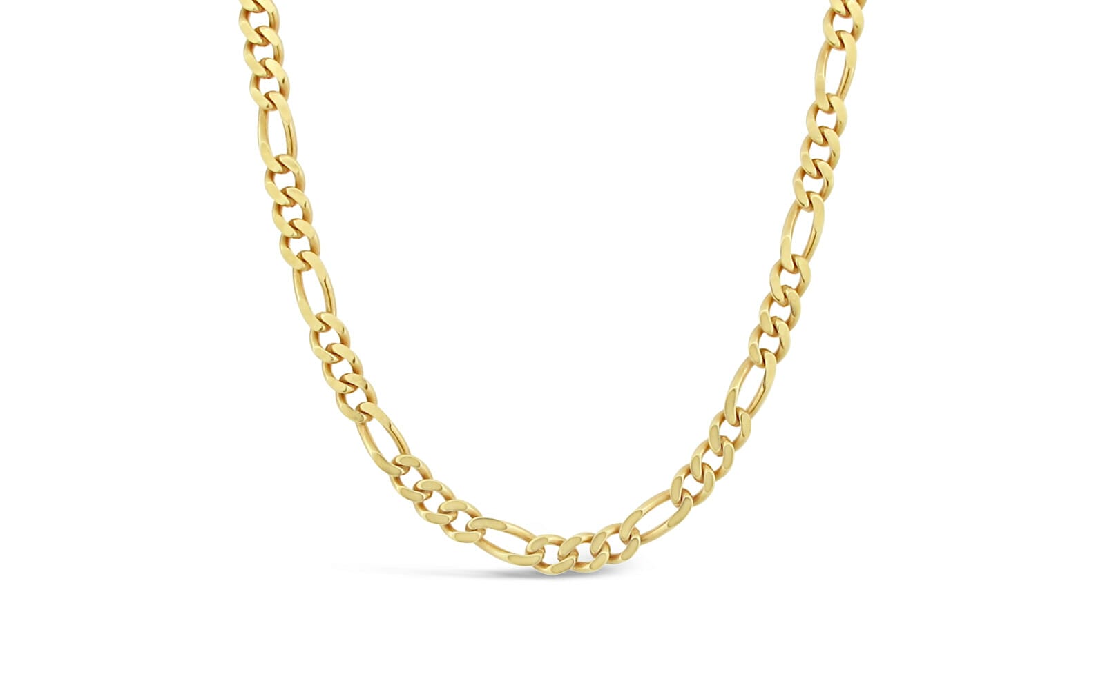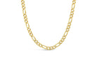 18K yellow gold Figaro chain measures 19 inches in length and 3.4 mm in width, featuring the classic alternating link design. Sleek and versatile, it can be worn alone or paired with a pendant for added elegance.