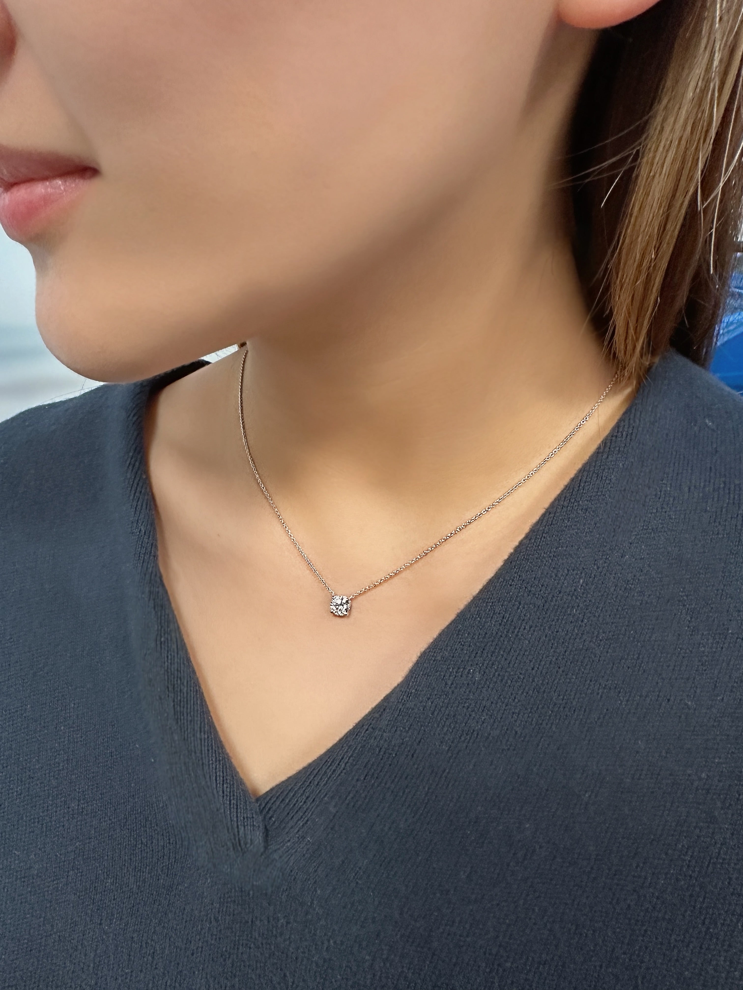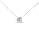 Elegant 14K white gold solitaire necklace showcases a stunning 0.75ct lab-grown round diamond centre in F colour and VS+ clarity. Accentuating its timeless appeal, the classic four-prong setting enhances the stone’s natural fire and brilliance. The refined round shape and minimalist design create a graceful balance of sophistication and shine.