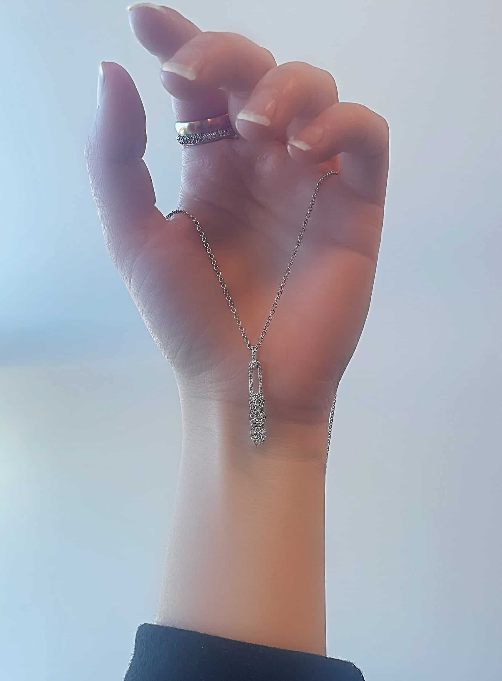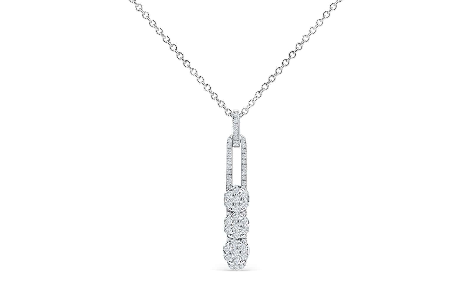 18K white gold Hulchi Belluni Tresore pendant features 0.60ctw of natural round diamonds in G–H colour and VS–SI clarity. Suspended from an 18-inch cable chain, it offers refined sparkle and elegance, making it a versatile addition to any jewellery collection.