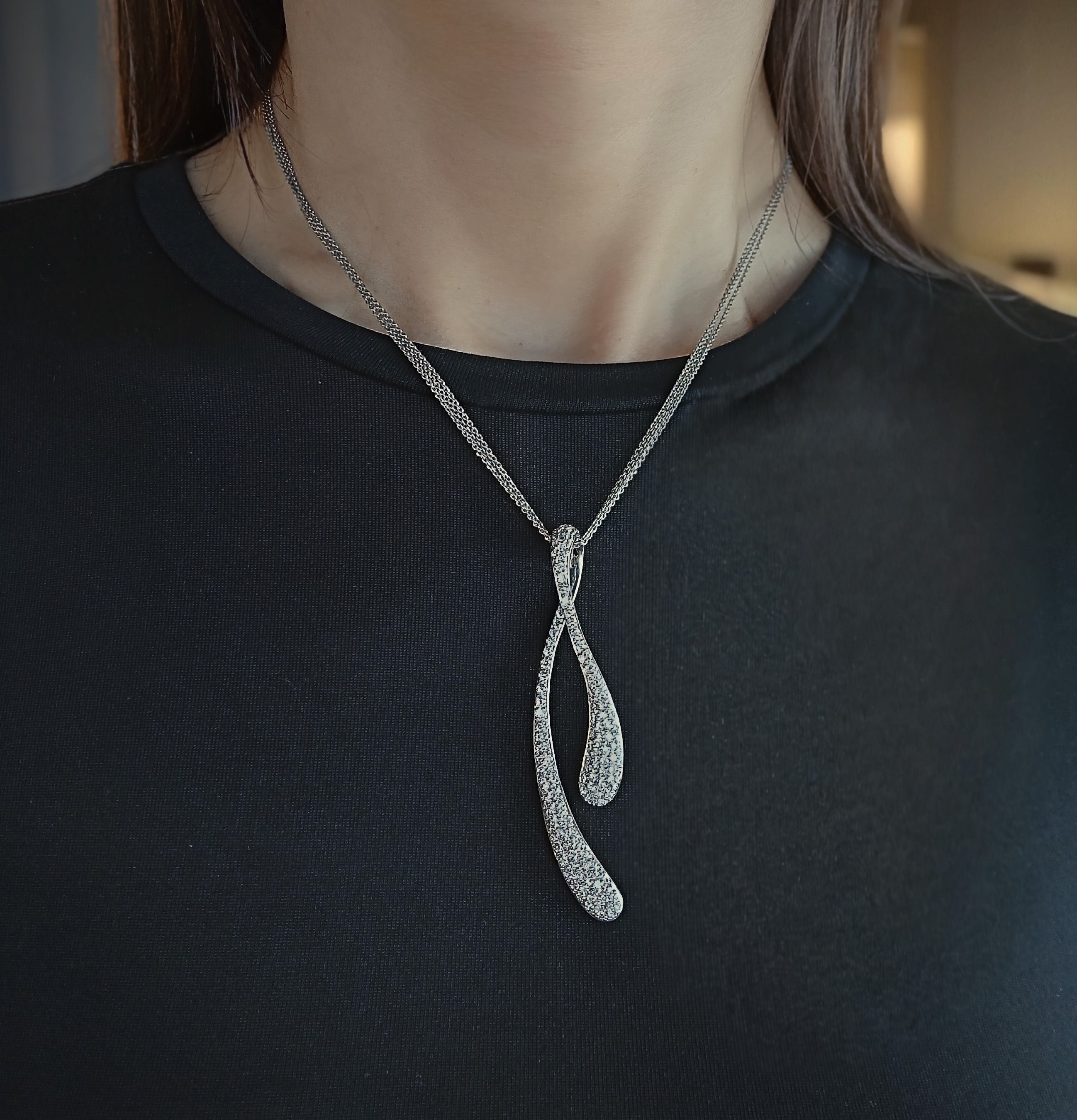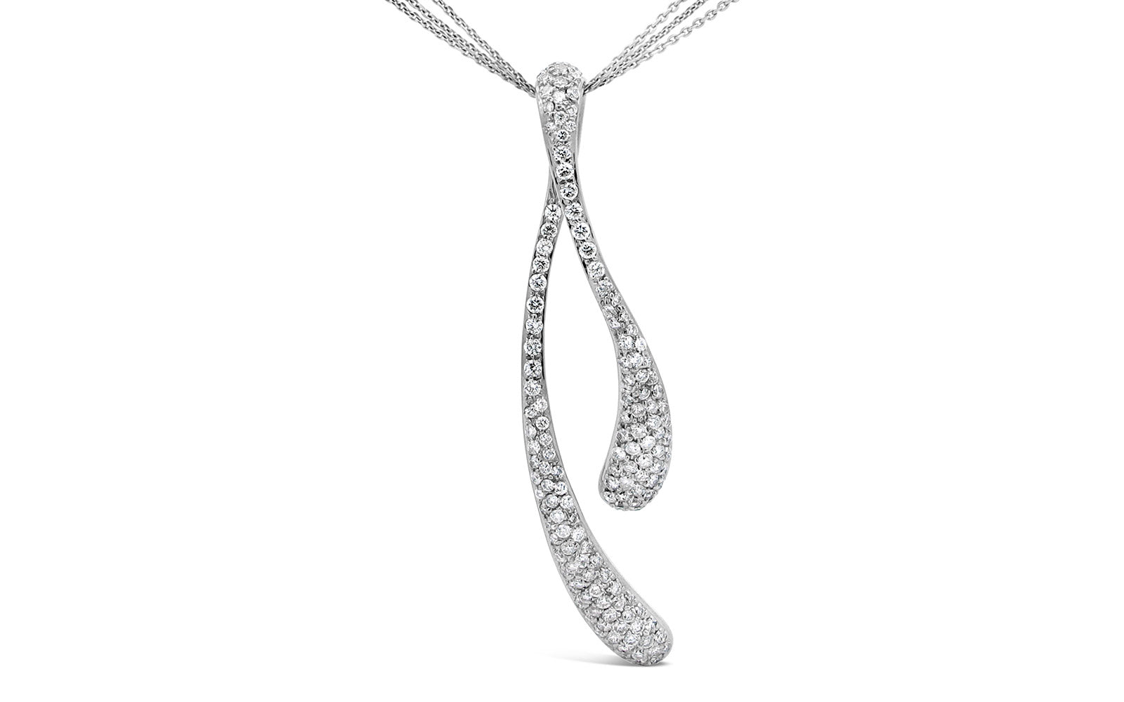 Elegant 14K white gold wishbone necklace features 3.88ctw of natural round brilliant stones in G–I/J colour and SI–I clarity. The graceful design is fully set for exceptional sparkle, creating a striking symbol of good fortune and timeless style.