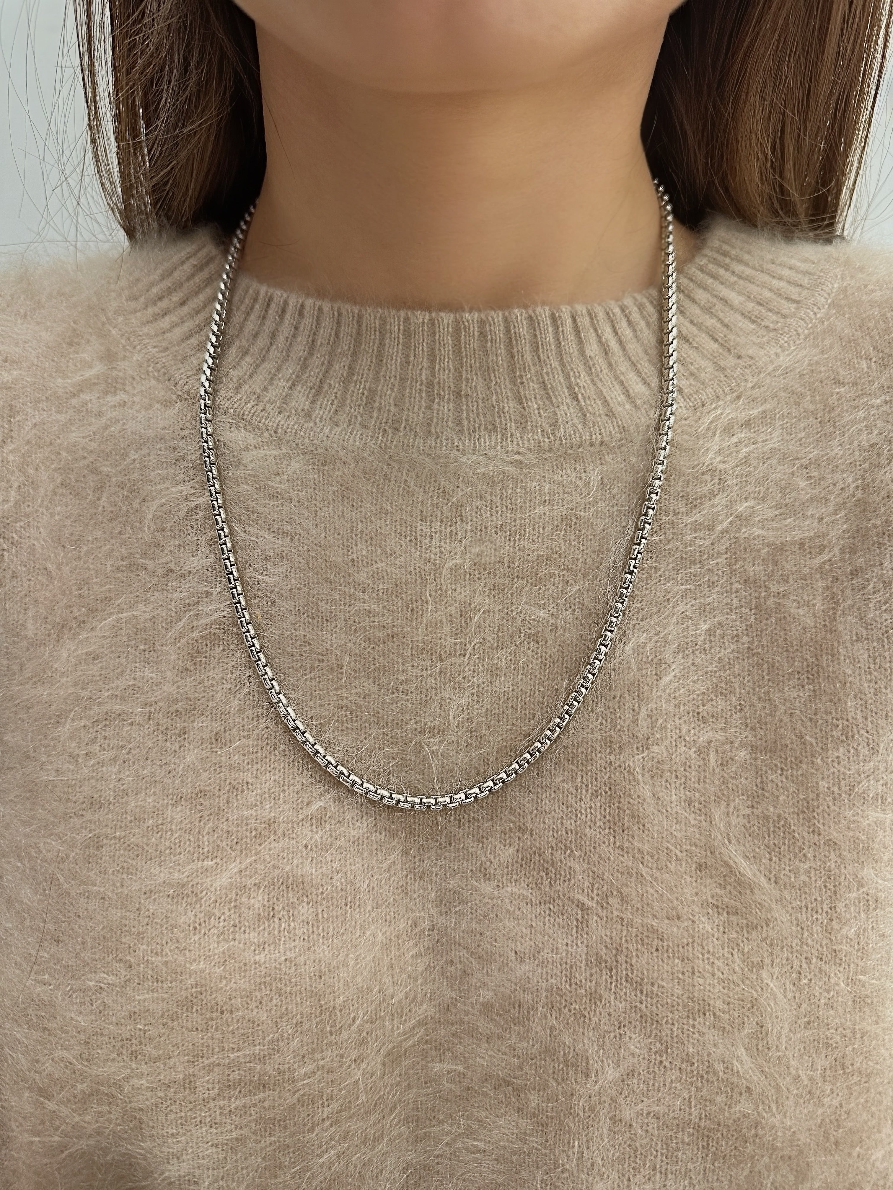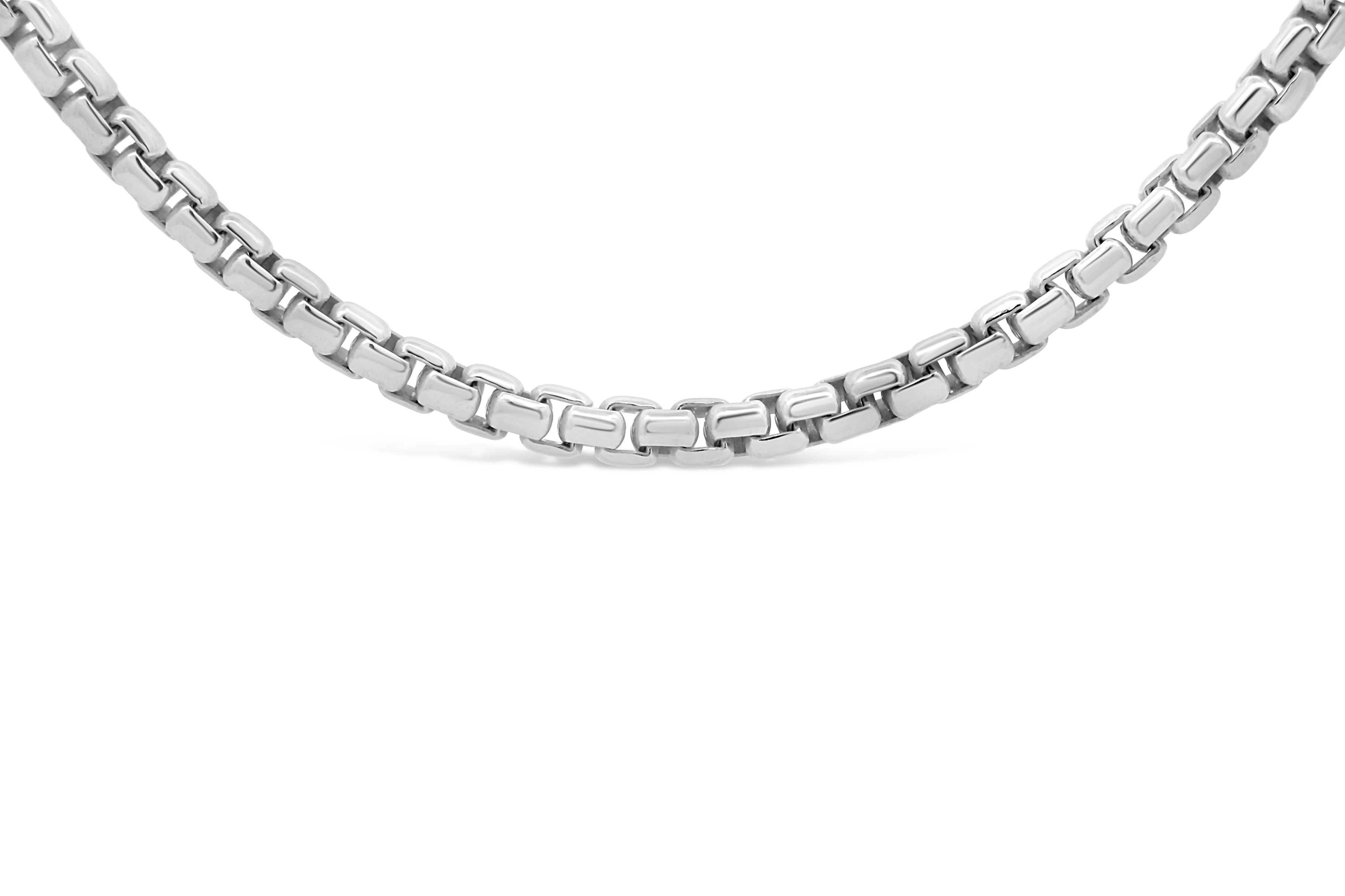 Sleek sterling silver rounded box chain features a 3.6mm width and a polished finish, offering a strong yet elegant look that works beautifully on its own or layered with a pendant. The 22-inch length provides a comfortable, versatile fit for everyday wear.