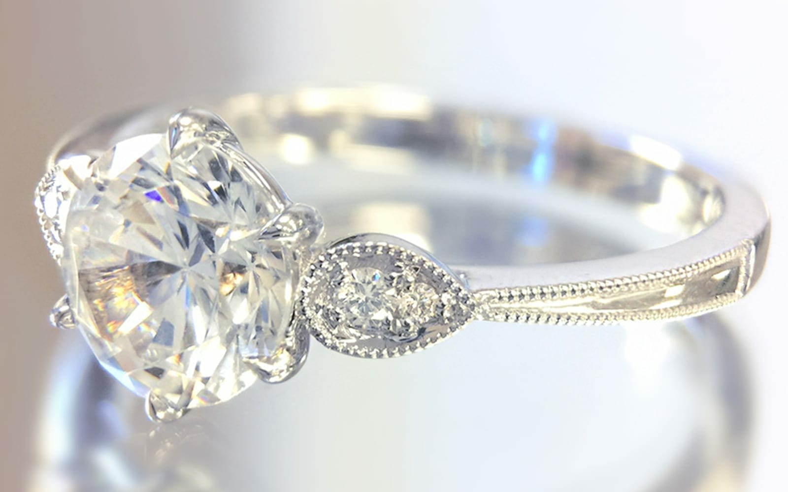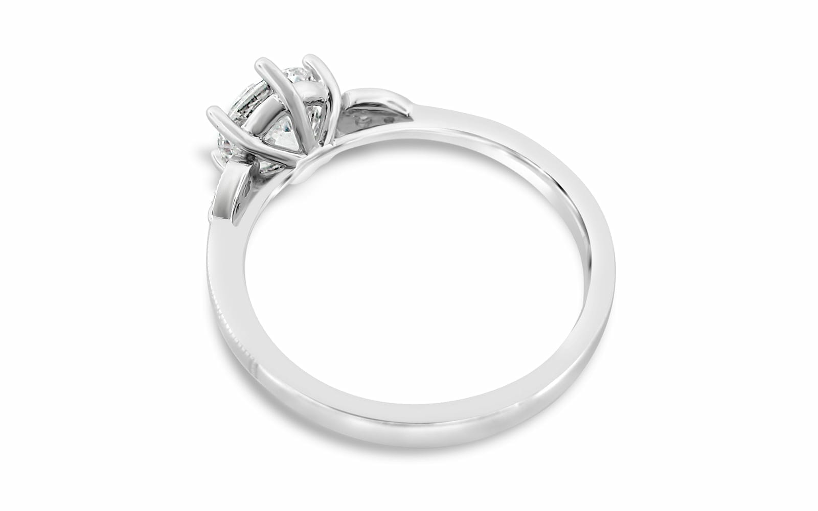 Sophisticated 18K white gold band features delicate milgrain etching and tapers towards a natural round brilliant-cut centre diamond weighing 1.00ct in J colour and SI1 clarity. Set in a six-prong crown setting, the centre is enhanced by round natural accent diamonds totalling 0.06ctw in G–H colour and VS1–VS2 clarity, creating a refined vintage-inspired look. Size 6.