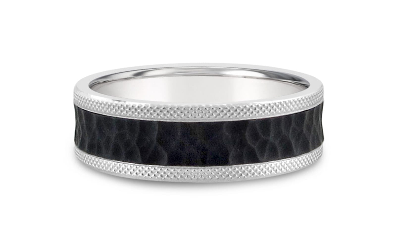 This 14kt white gold 7mm band features a black titanium hammered center with raised patterned edges. This ring is currently a finger size 10.