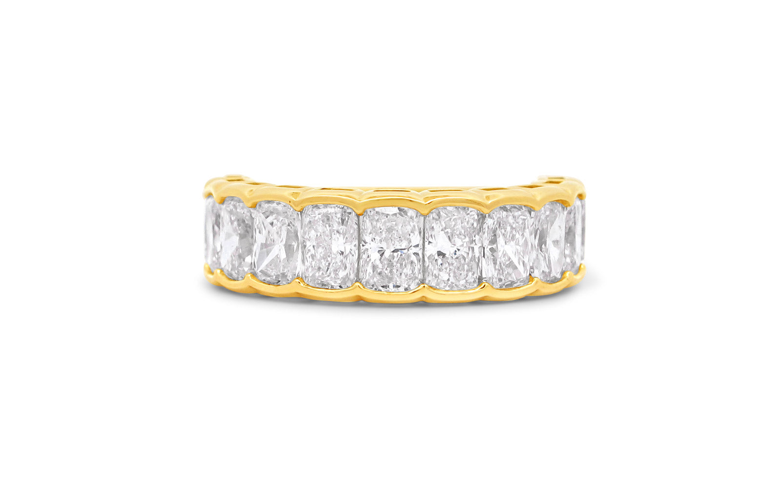 Striking 14K yellow gold band showcases eleven lab-grown radiant stones totalling 3.07 ctw in F+ colour and VS+ clarity. Each gem is securely held in a sleek semi-bezel setting, creating a refined balance of brilliance and modern design. Size 5.5.