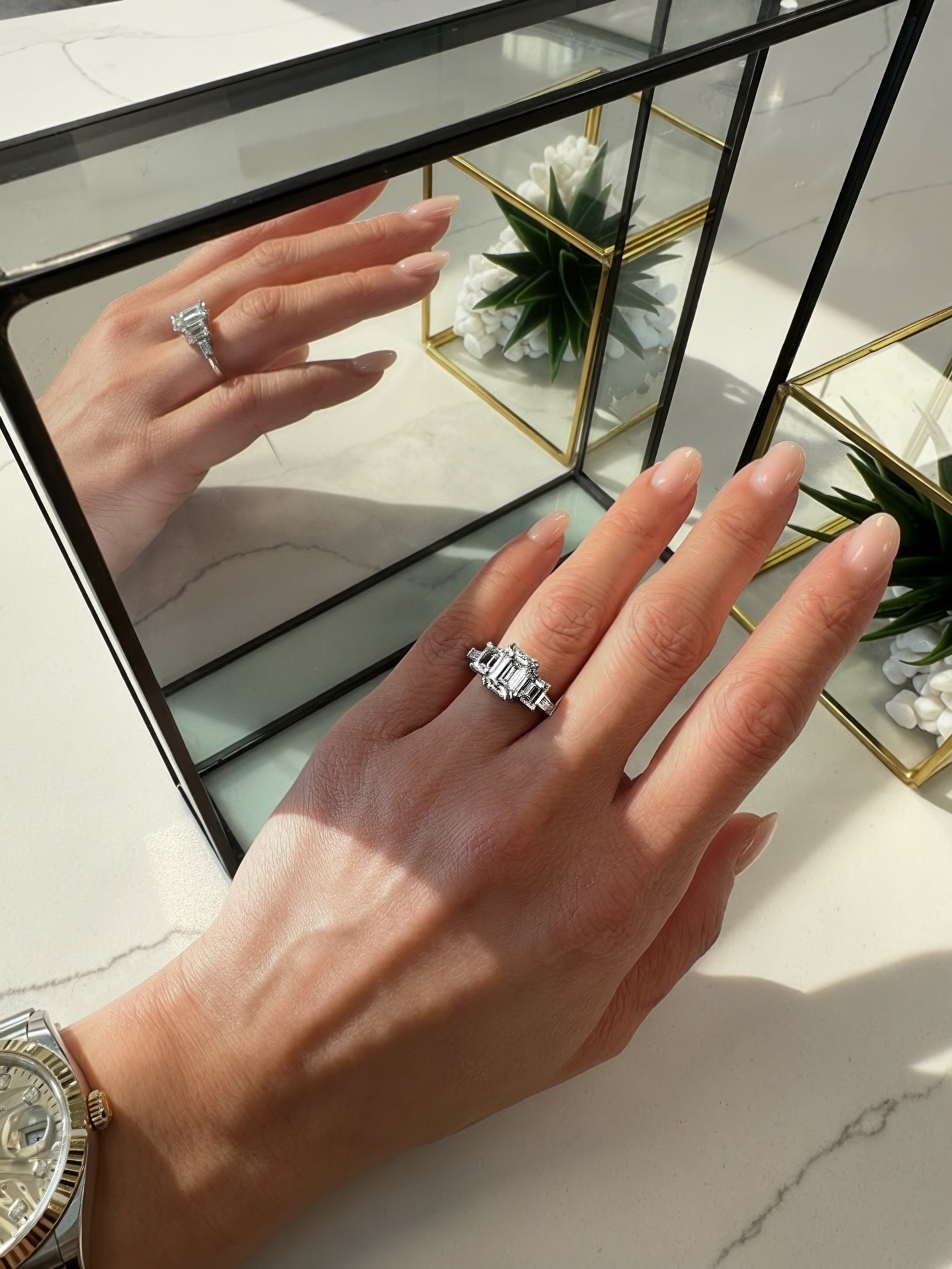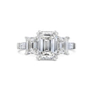 Exceptional platinum ring features a 2.02ct natural emerald cut emerald in H colour and IF clarity. Accentuating the centre stone are 0.99ctw emerald cut diamonds in H–I colour and IF clarity, along with 0.22ctw baguette diamonds in G–I colour and VS clarity. The refined three stone design showcases striking symmetry and timeless sophistication.