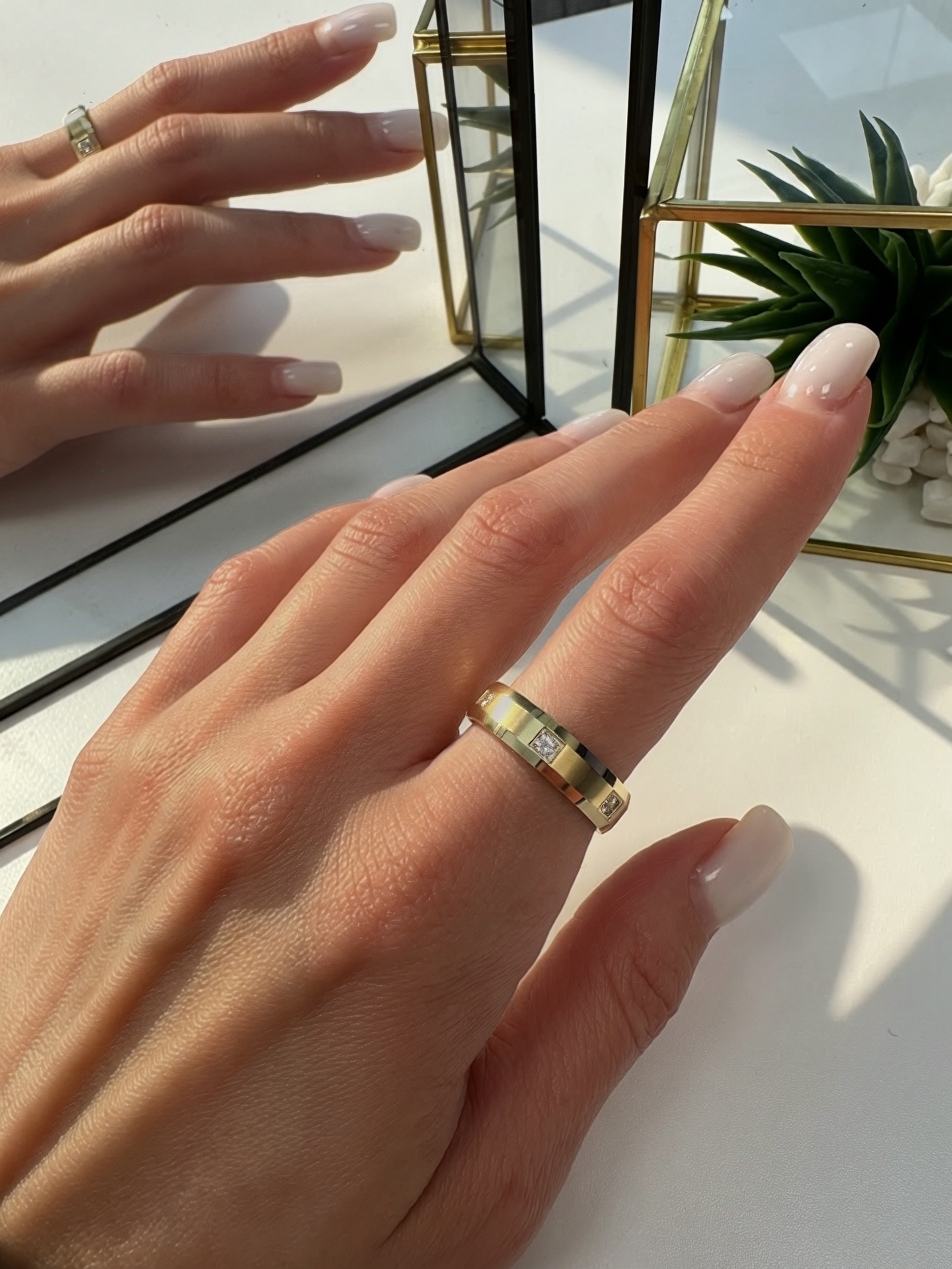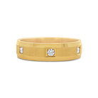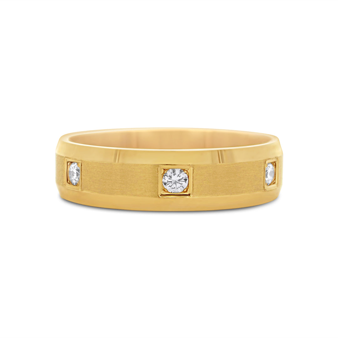 striking 14K yellow gold band features a 6 millimetre satin centre accented by 3 round brilliant stones totalling 0.18ctw in G–H colour and VS–SI clarity. The beveled edges frame the centre beautifully, adding dimension and refined contrast.