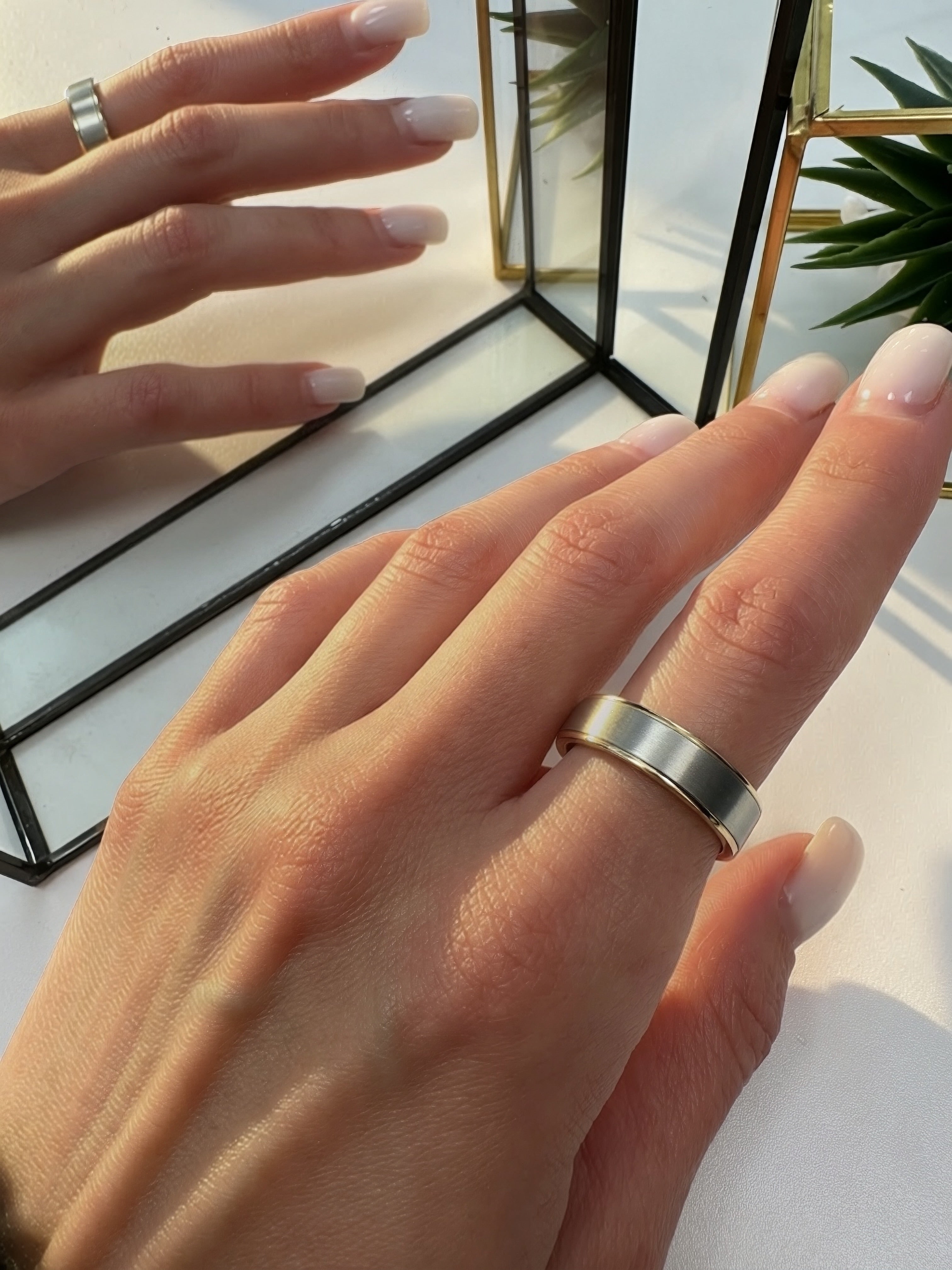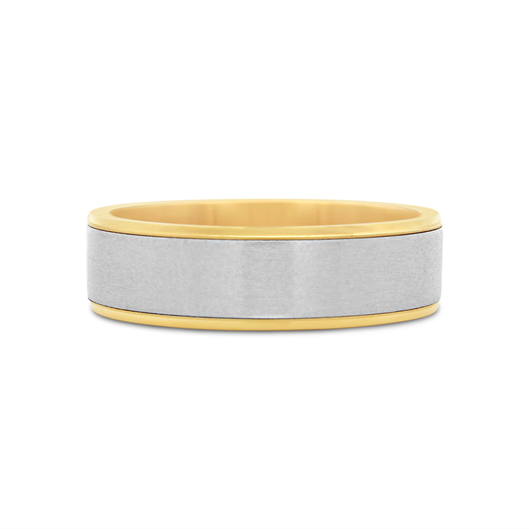Refined 14K yellow and white gold band features a 6.5 millimetre satin centre framed by thin polished edges. The soft matte texture contrasts beautifully with the smooth finish, creating a clean and modern statement. Size 10.