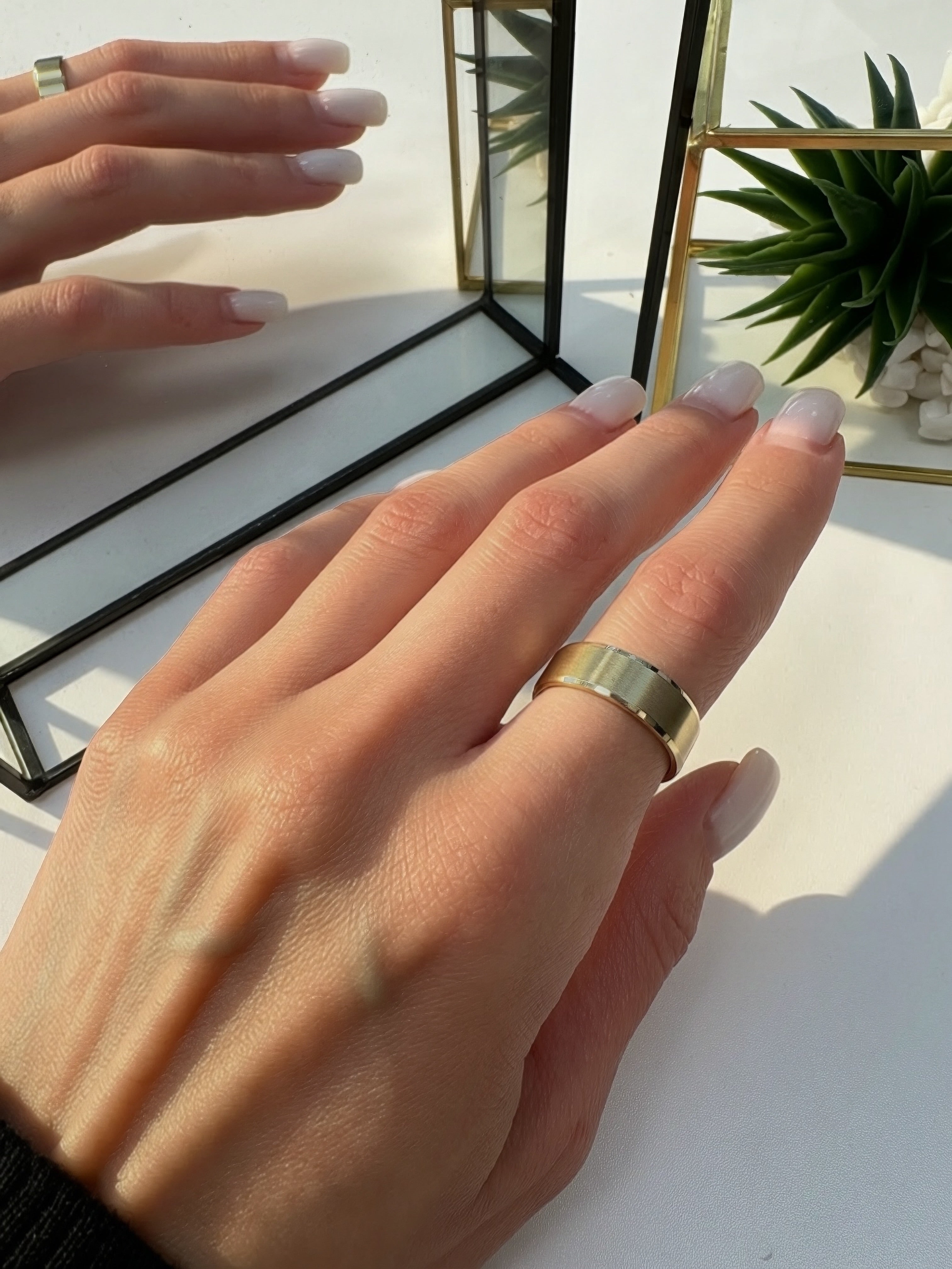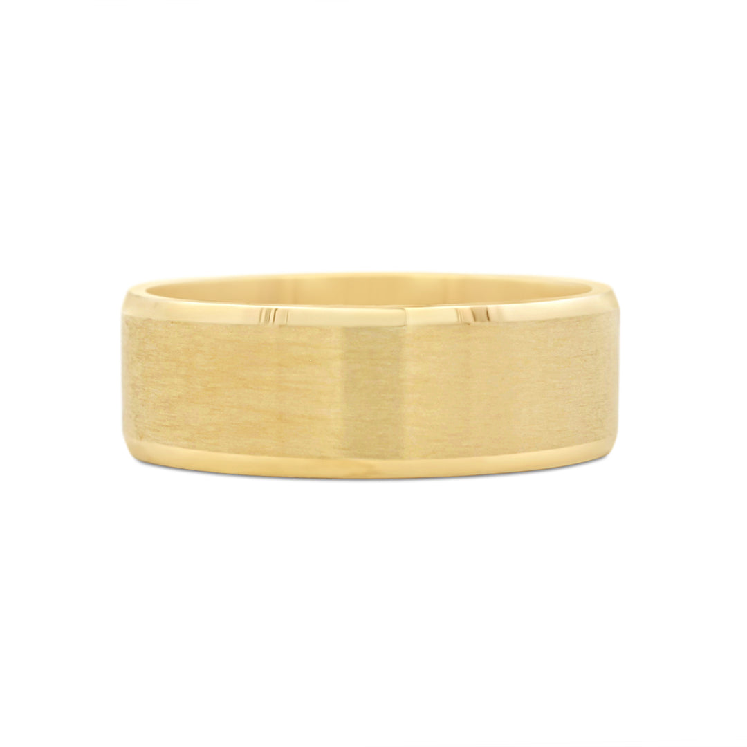 Refined 14K yellow gold band features a 7 millimetre satin finish accented by beveled edges. The light comfort fit design offers a smooth interior for everyday wear, while the contrast of matte and polish creates a clean, timeless look. Size 8
