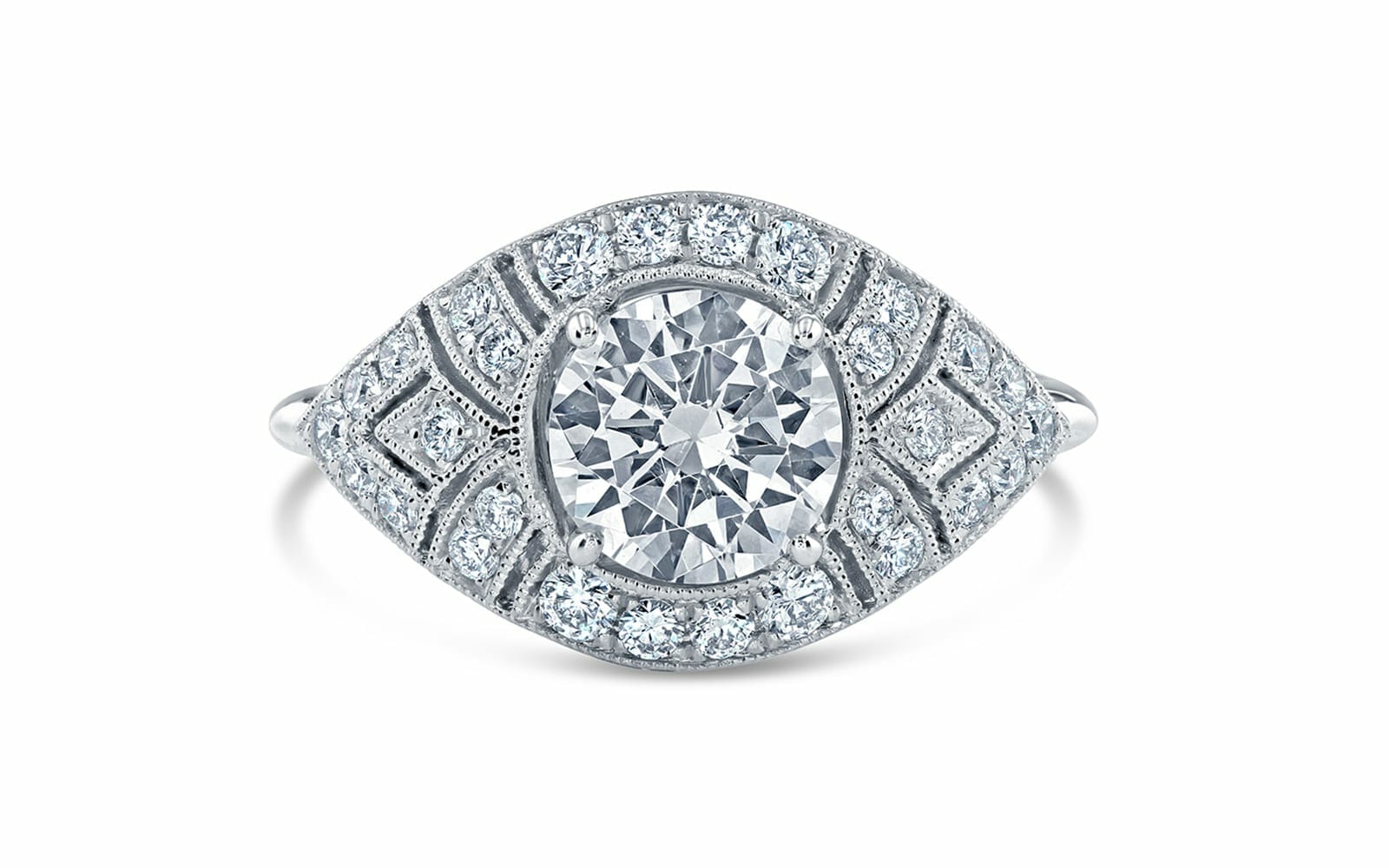 This 18kt white gold Art Deco-inspired ring design features fine millgrain and geometric shapes. It is accented with 26 round brilliant cut natural diamonds, totalling 0.30 carats, G-H colour and VS-SI clarity.