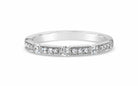 18kt white gold band features 17 round brilliant diamonds, 0.30 total carat weight, G-H colour, VS-SI clarity, surrounded by milgrain accents and set in a geometric shape to give it an art-deco feel.