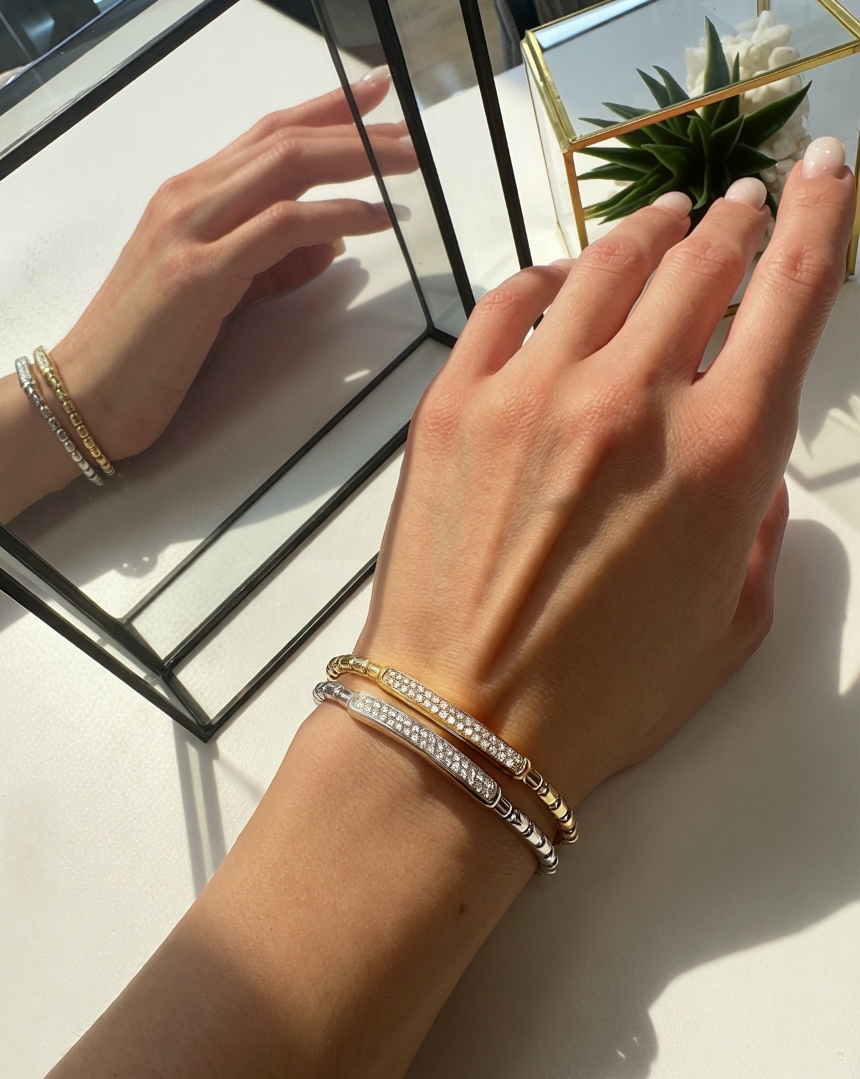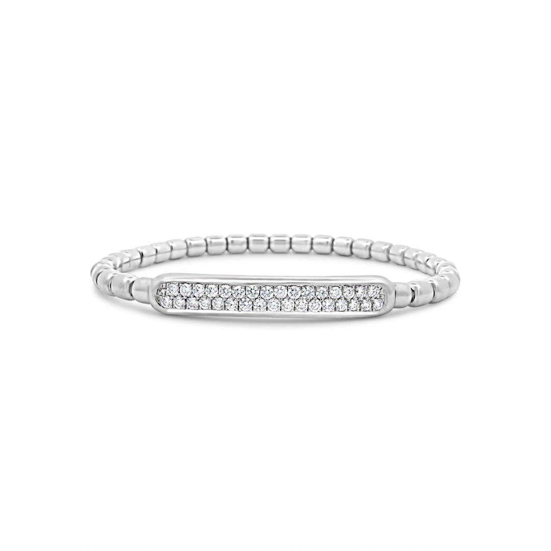 18KW bead pave stretch bracelet features 33 round brilliant stones totalling 0.65ctw in G–H colour and VS–I clarity. The flexible stretch design ensures a comfortable fit while the bead-set pave enhances each stone’s brilliance. Effortlessly elegant and easy to wear, it adds refined sparkle to any look.