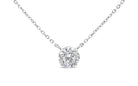 14K white gold necklace features a single natural round diamond weighing 1.00ct in E–F colour and SI1 clarity. The classic solitaire setting on a 16-inch chain showcases the diamond’s brilliance, creating a timeless and elegant piece perfect for everyday wear or special occasions.