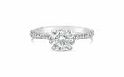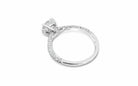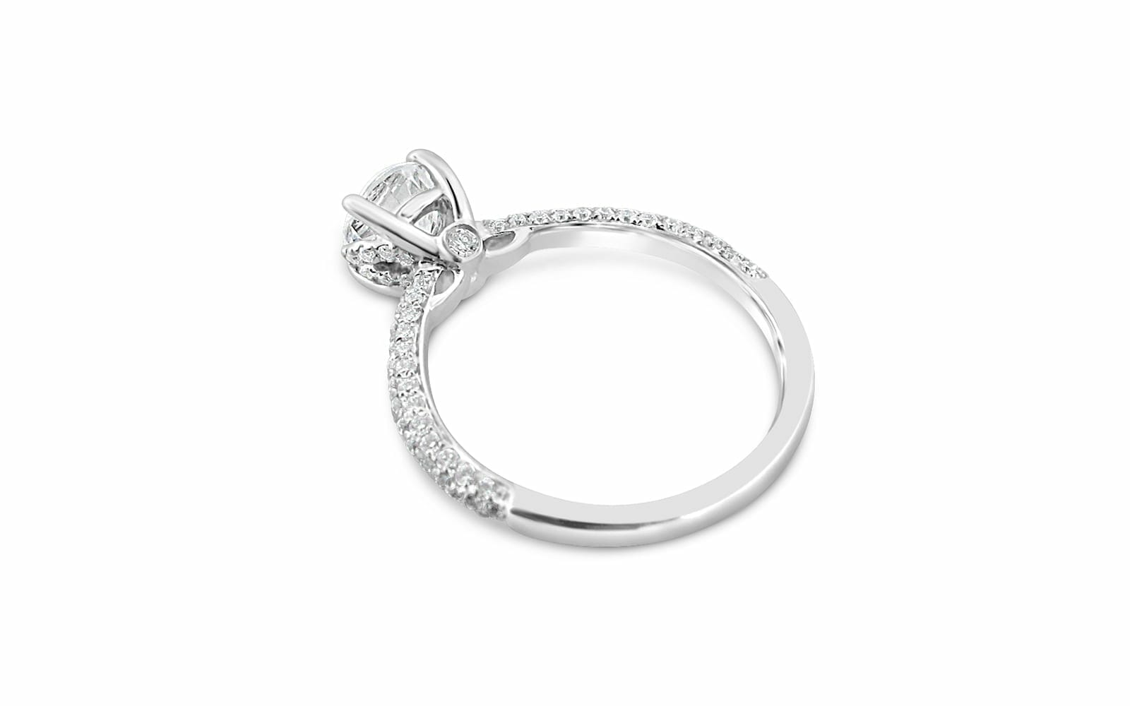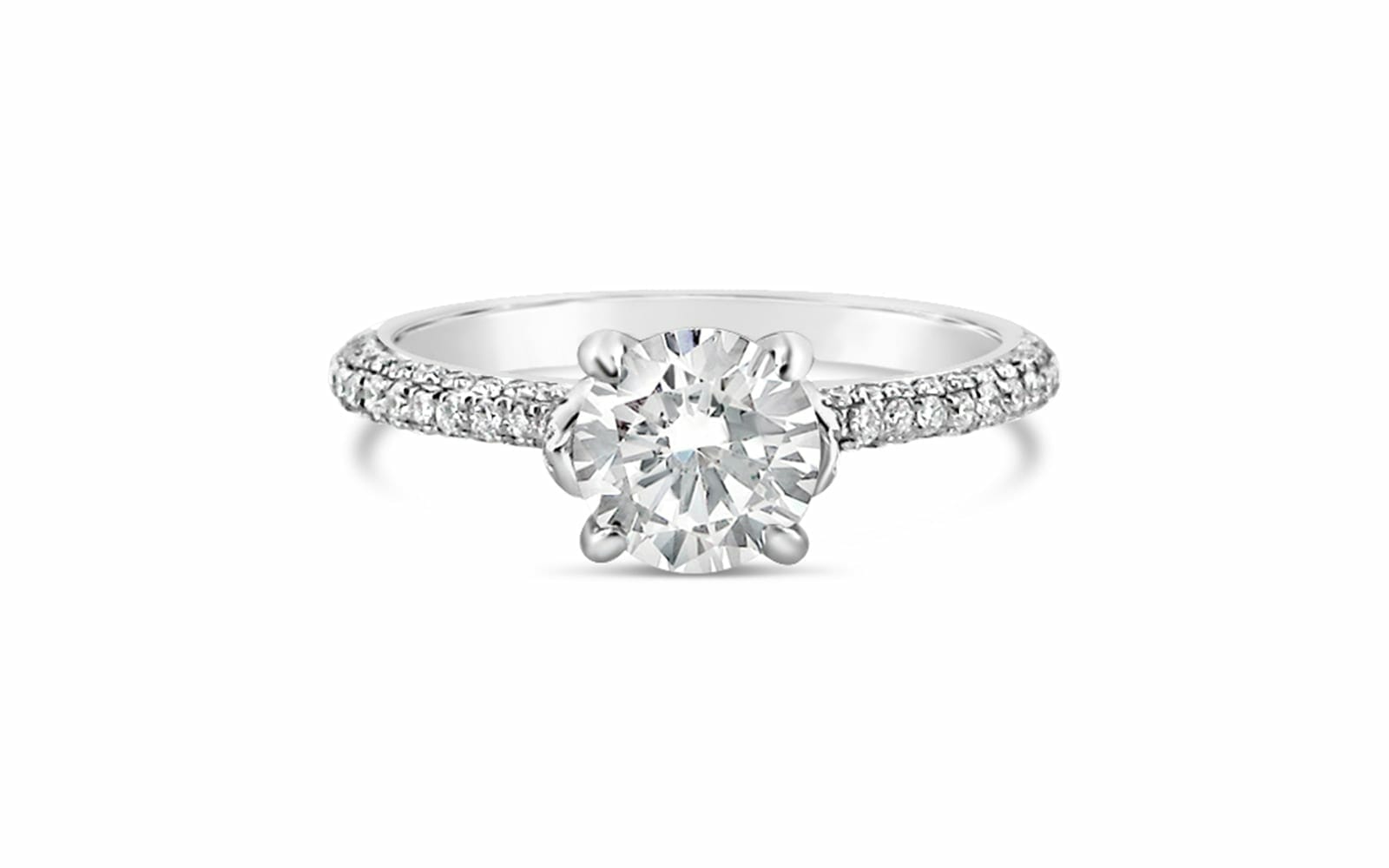 This sparkling 18kt white gold engagement ring features a natural round brilliant cut diamond weighing 0.77 carats, H-I colour and SI2 clarity. It is accented with 96 pave set natural diamonds weighing 0.43 total carats, G-I colour, and VS-I1 clarity.