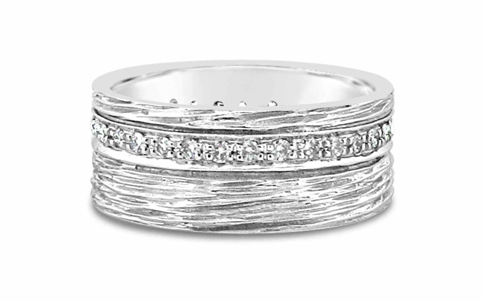 White gold eternity band features 31 round brilliant natural diamonds with a stone finish. This ring is finger size 5.75.