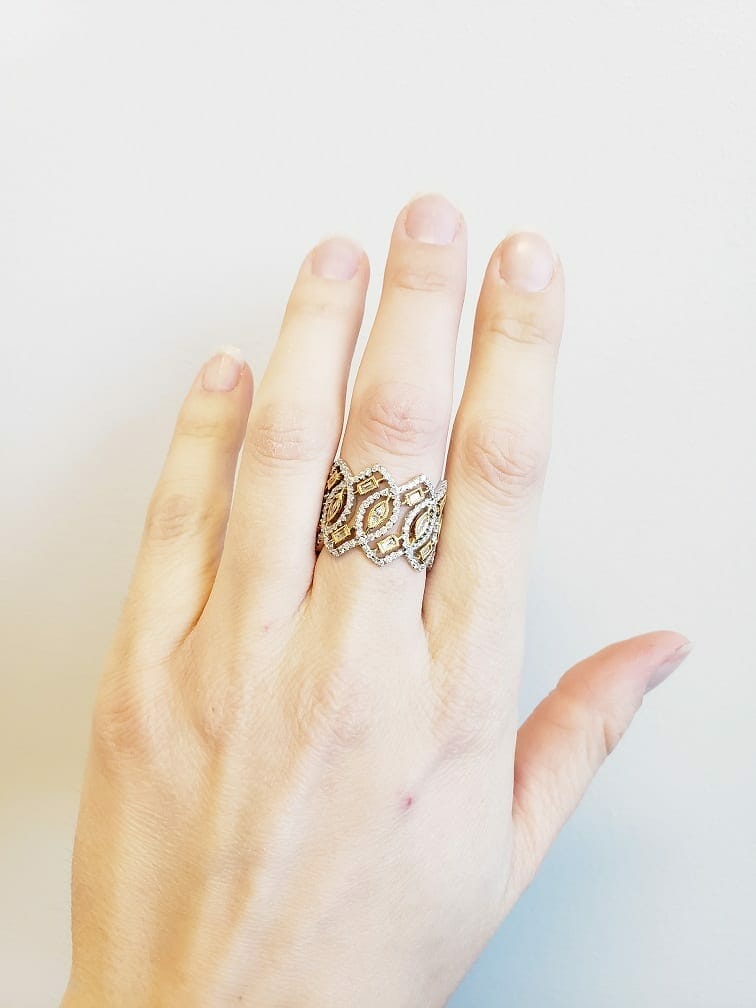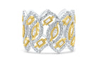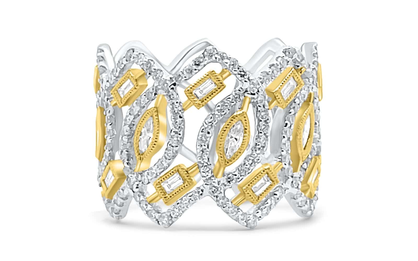 This stunning yellow and white gold ring features 181 round mined diamonds set in a unique lattice style pattern.