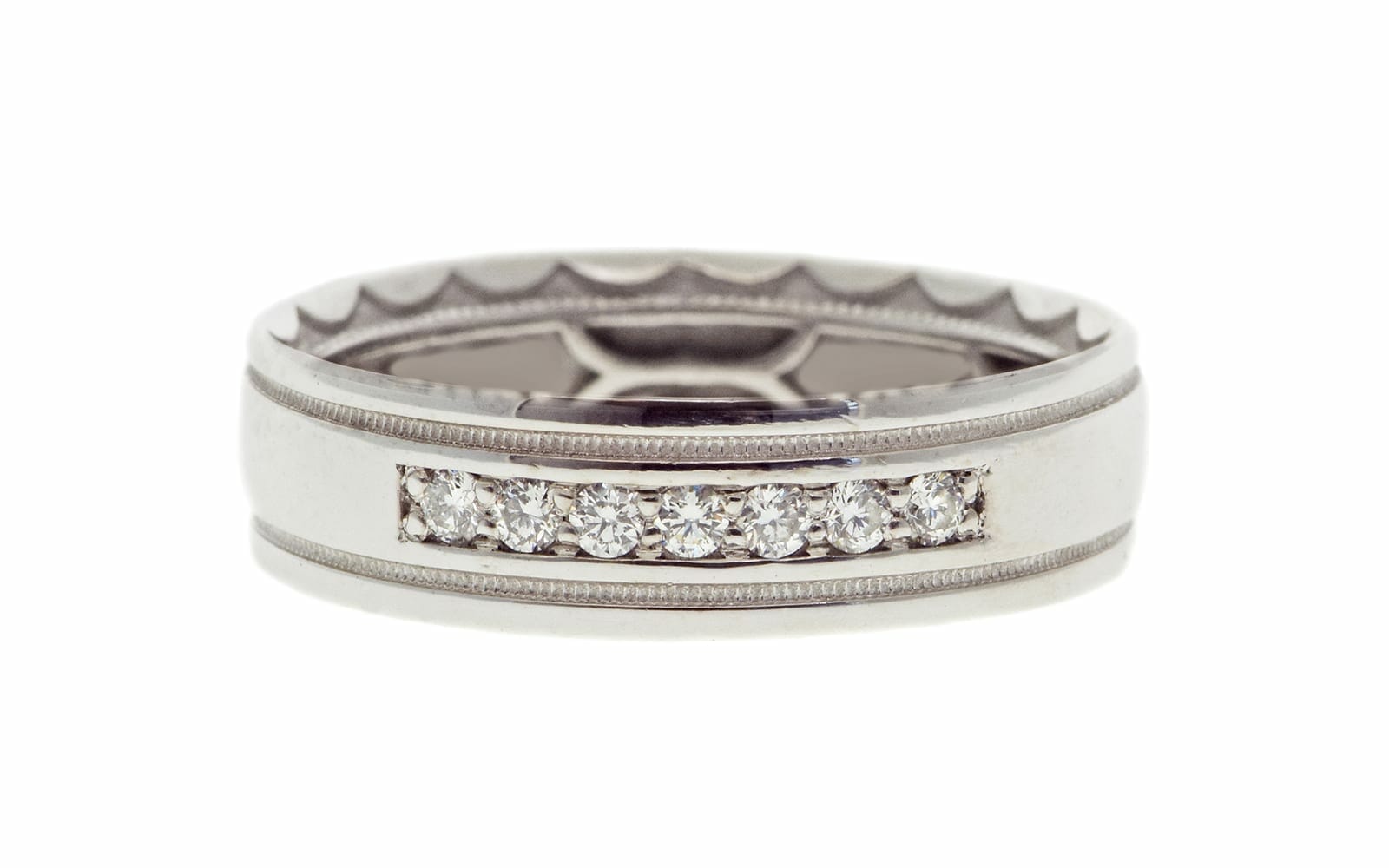This Tacori branded men's ring, beautifully set with 7 round diamonds, features milgrain and side design details. This ring is a size 9.5 and measures 6mm in width.