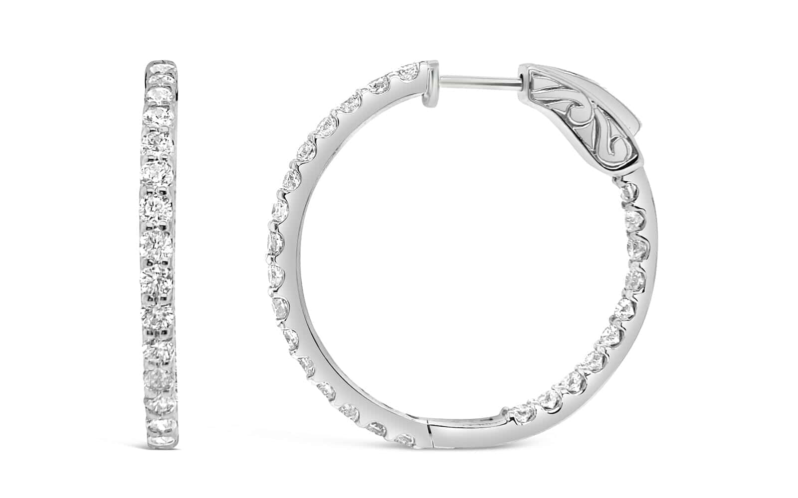 Set in 14 karat white gold, this pair of 1.82 total carat natural diamond hoops feature diamonds on the inside and outside of the setting! A perfect gift for yourself or others.
