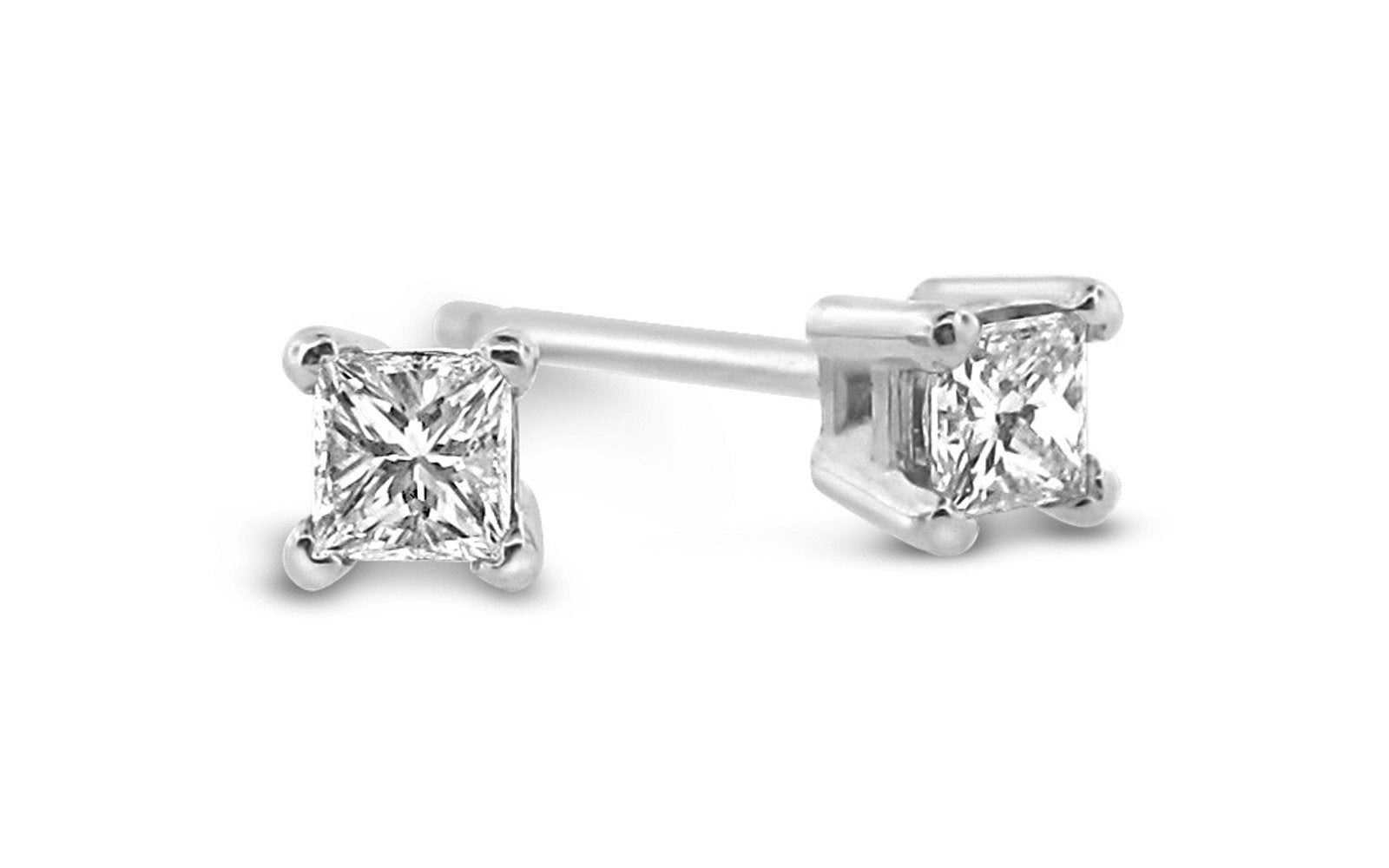 These 14kt white gold four prong studs feature 2 princess cut diamonds, 1.42 total carat weight, F-G colour, SI1-SI2 clarity.