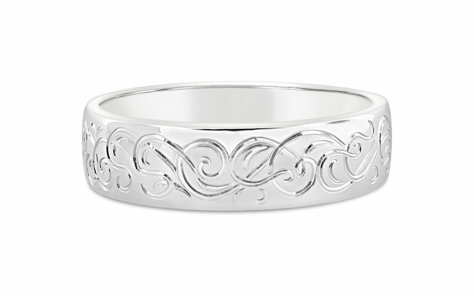 This 6.5mm wide band features custom hand engraving. This ring is a finger size 10.