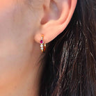 Set in 14 karat yellow gold, these hoop earrings feature 2 pear faceted natural rubies weighing 0.35 total carats, 4 round brilliant natural diamonds, 0.15 total carats.